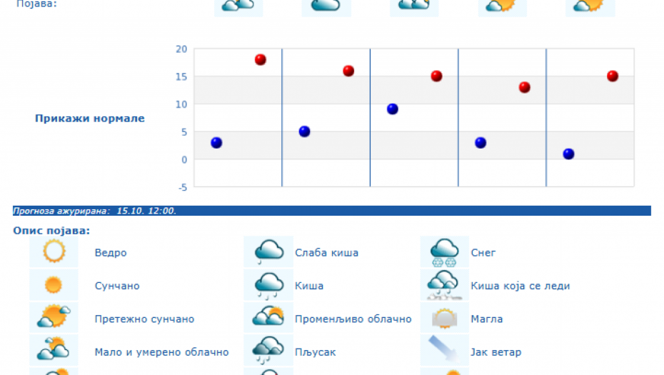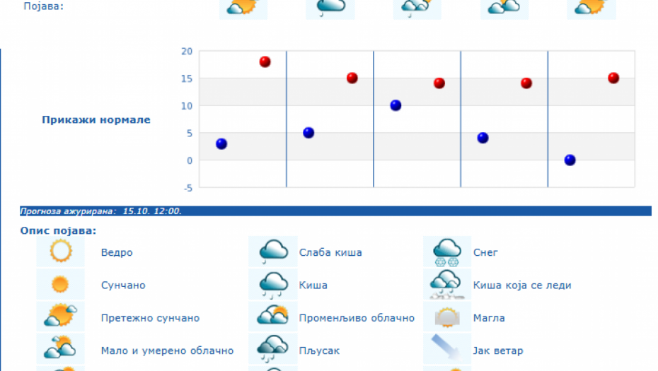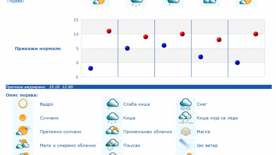 Vetar će biti slab i umeren, istočni i jugoistočni, dok će se najniža temperatura kretati od 0 do 7, a najviša od 15 do 20 stepeni Celzijusa. Uveče i tokom noći očekuje se postepeno naoblačenje s juga, koje će na jugu i jugozapadu Srbije ponegde usloviti slabu kišu.