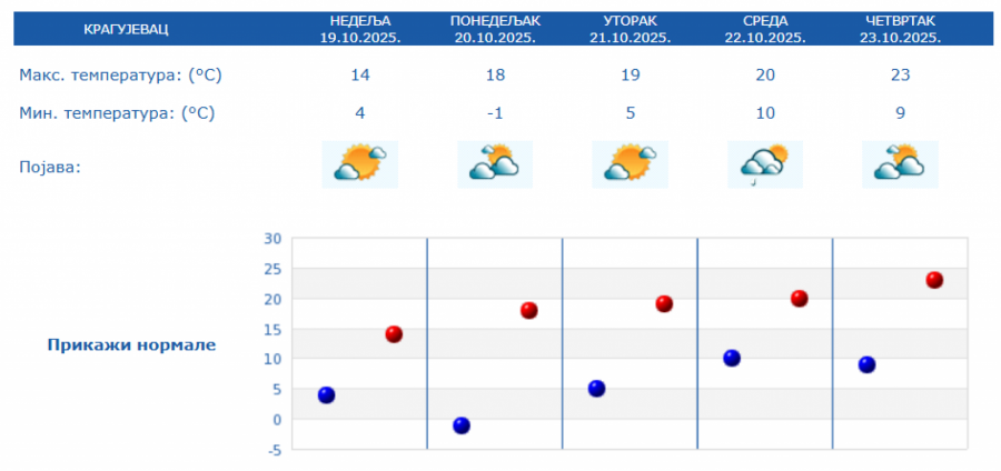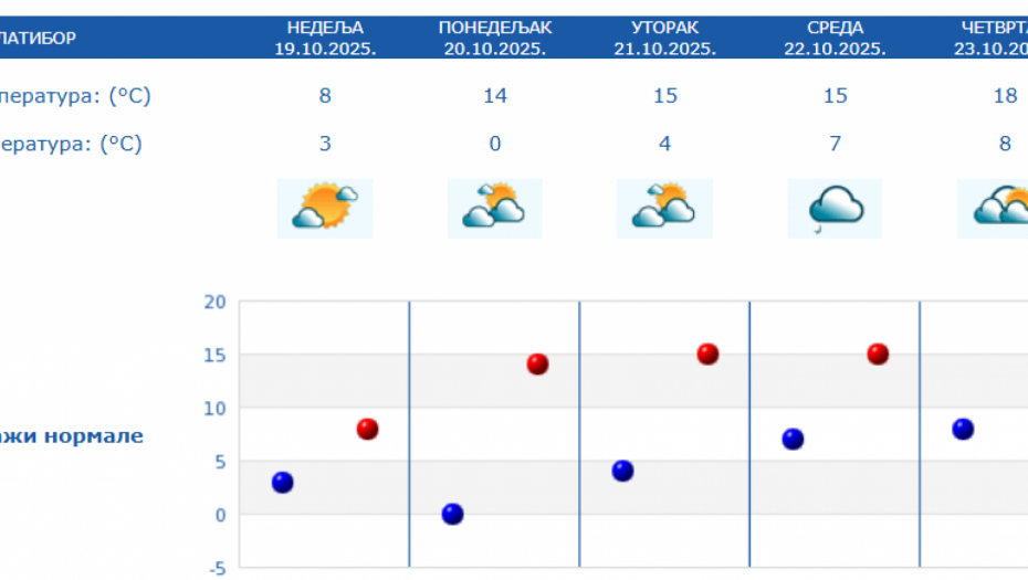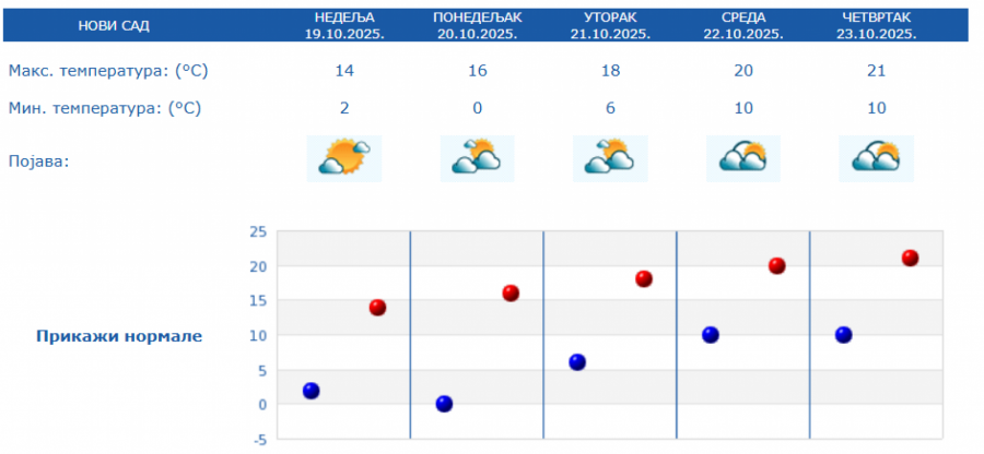 U Vojvodini i centralnoj Srbiji moguć je slab prizemni mraz, dok će jug i jugozapad zemlje ujutru biti oblačni, ponegde sa slabom kišom. Tokom dana i u tim krajevima razvedravanje i sunčani periodi.