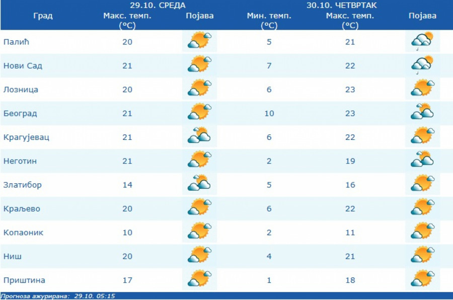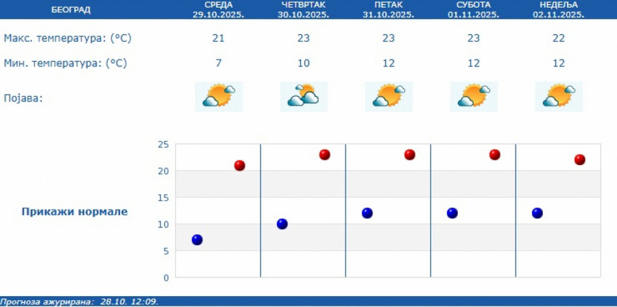 U Beogradu se, nakon hladnog jutra, tokom dana očekuje pretežno sunčano i osetno toplije vreme. Duvaće slab i umeren vetar južnih pravaca. Najniža temperatura biće od 4 do 7 stepeni, a najviša oko 21.