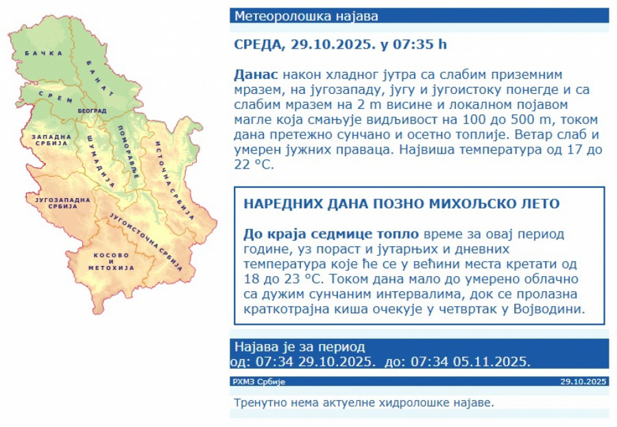 Duvaće slab i umeren vetar južnih pravaca. Najniža temperatura biće od 0 do 7 stepeni, a najviša od 17 do 22, navodi RHMZ.