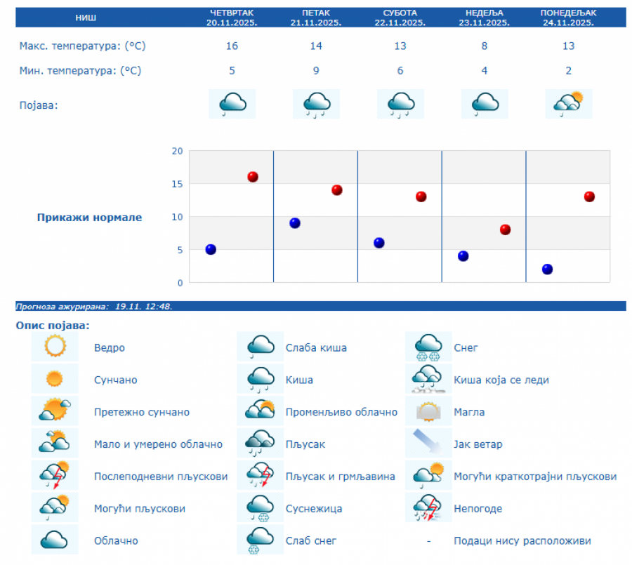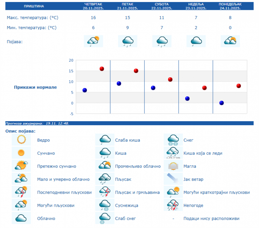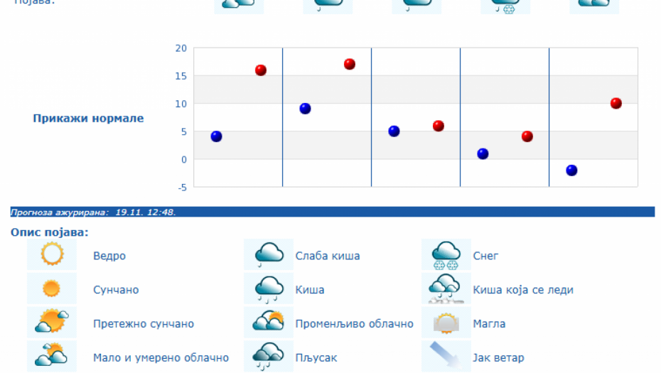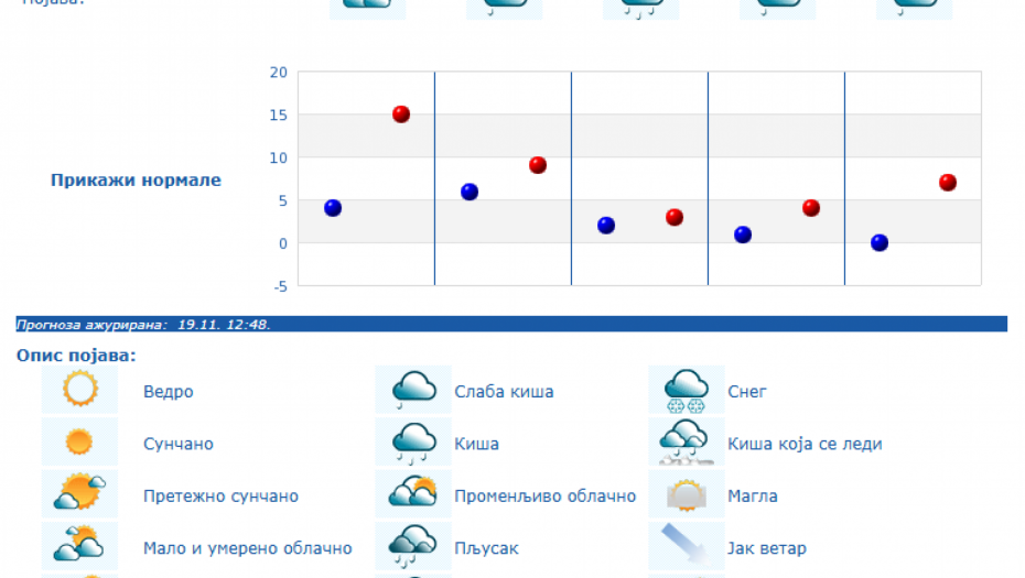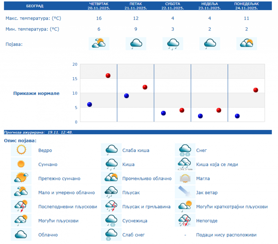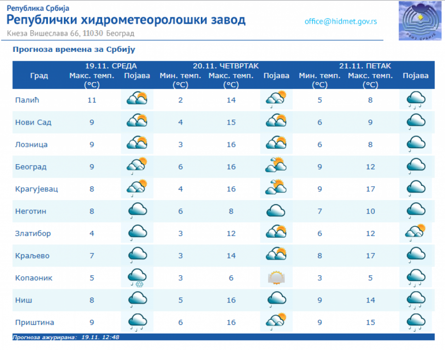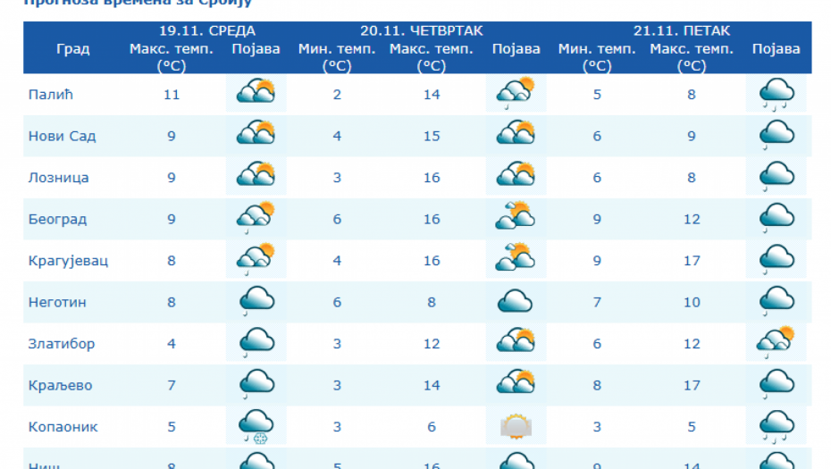 U Srbiji će u četvrtka, 20. novembra biti pretežno sunčano uz malu i umerenu oblačnost i toplije, osim na jugu i istoku Srbije gde će biti pretežno oblačno, dok se posle podne očekuje povećanje oblačnosti, uveče i noću sa kišom u južnim, istočnim i centralnim predelima Srbije, kao i na severozapadu Vojvodine, saopštio je danas Republički hidrometeorološki zavod.
