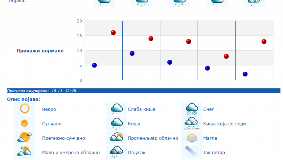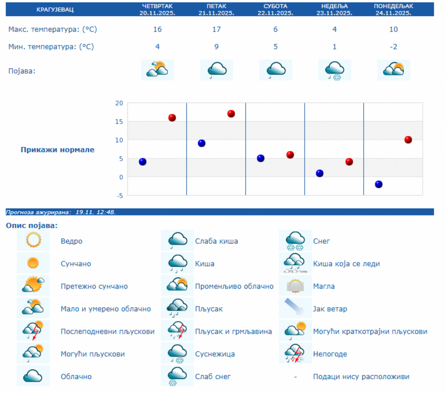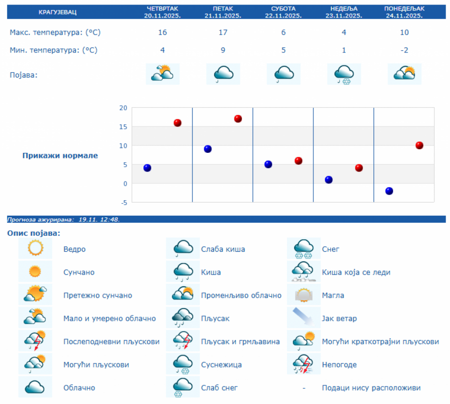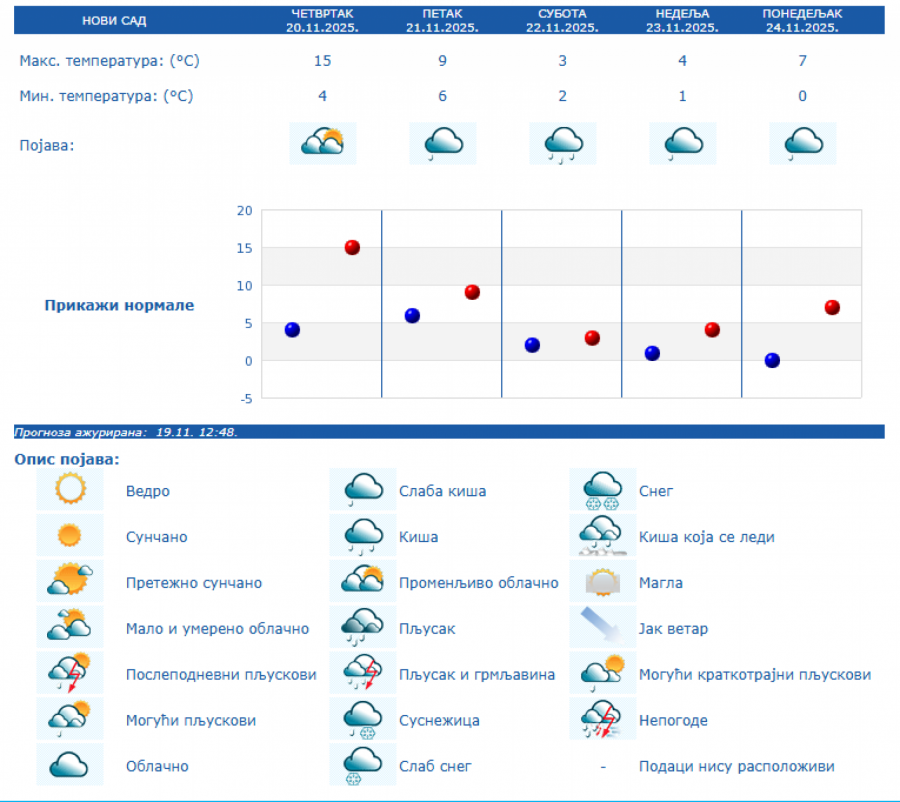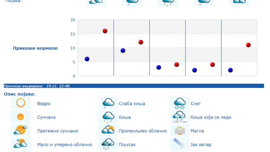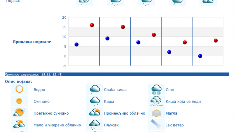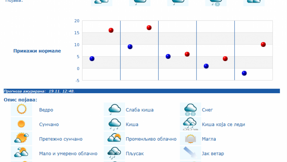 U Srbiji će u četvrtka, 20. novembra biti pretežno sunčano uz malu i umerenu oblačnost i toplije, osim na jugu i istoku Srbije gde će biti pretežno oblačno, dok se posle podne očekuje povećanje oblačnosti, uveče i noću sa kišom u južnim, istočnim i centralnim predelima Srbije, kao i na severozapadu Vojvodine, saopštio je danas Republički hidrometeorološki zavod.