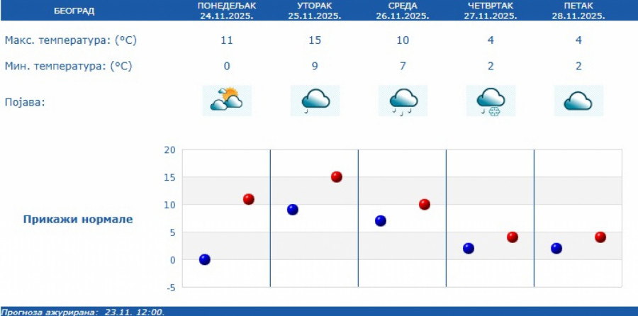 Zatim će uslediti osetno svežije vreme, u četvrtak se očekuju padavine uglavnom južnije od Save i Dunava i to u nižim predelima kiša, susnežica i sneg, a u brdsko-planinskim predelima sneg uz formiranje snežnog pokrivača.