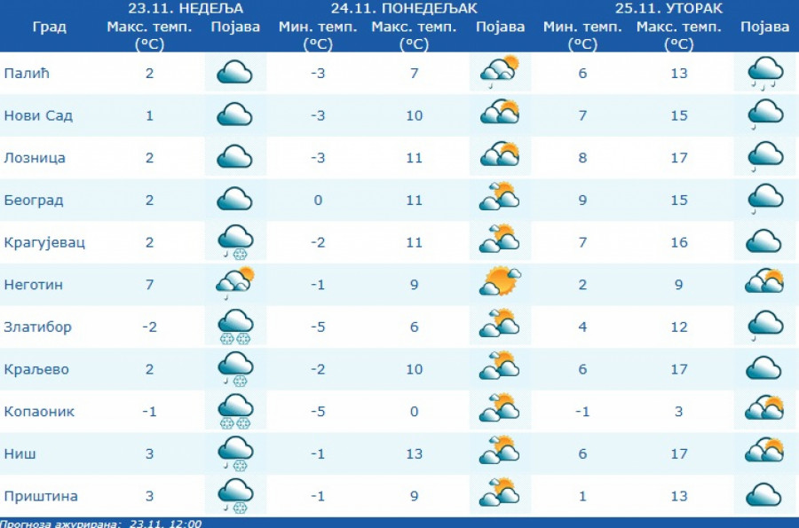 Duvaće slab i umeren vetar, tokom noći i jak jugoistočni. Najniža temperatura biće od minus 3 do 0, a najviša oko 11 stepeni. Tokom noći očekuje se kiša.