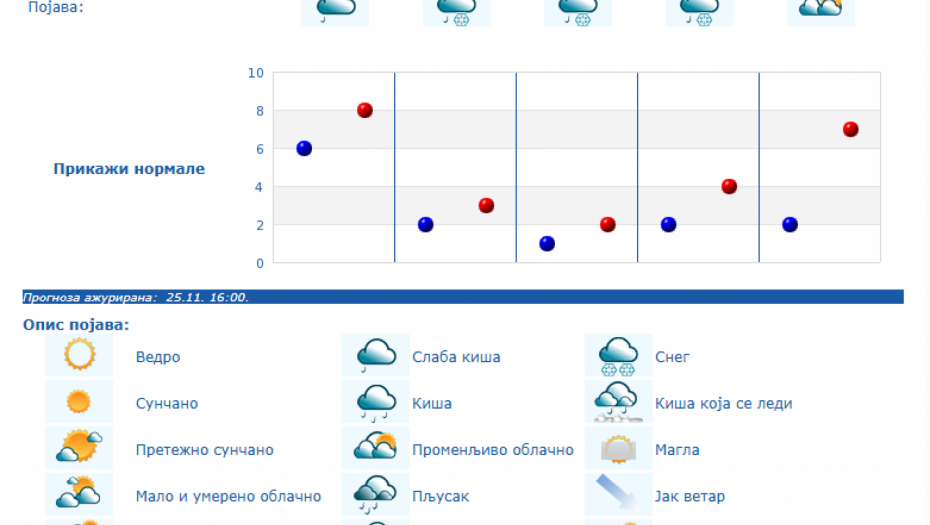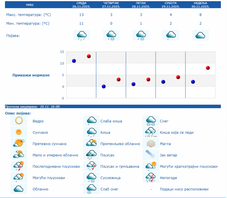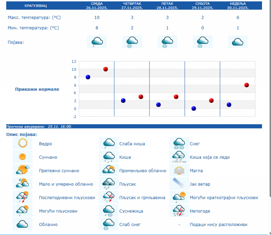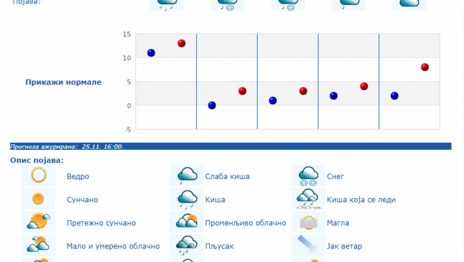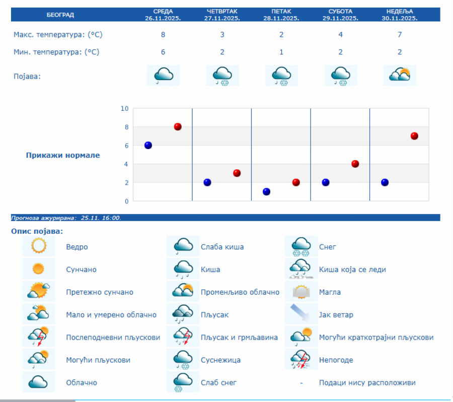 U četvrtak i petak uslediće oblačno i hladnije vreme, mestimično s kišom, u brdsko-planinskim predelima sa snegom uz formiranje snežnog pokrivača. Susnežica i sneg se očekuju ponegde i u nižim predelima zapadne, centralne i južne Srbije uz lokalno formiranje manjeg snežnog pokrivača.