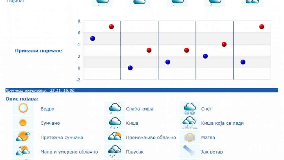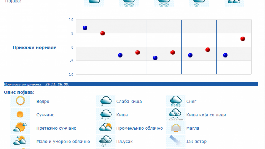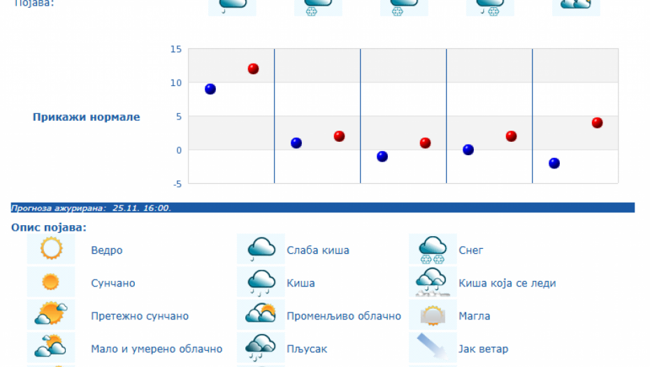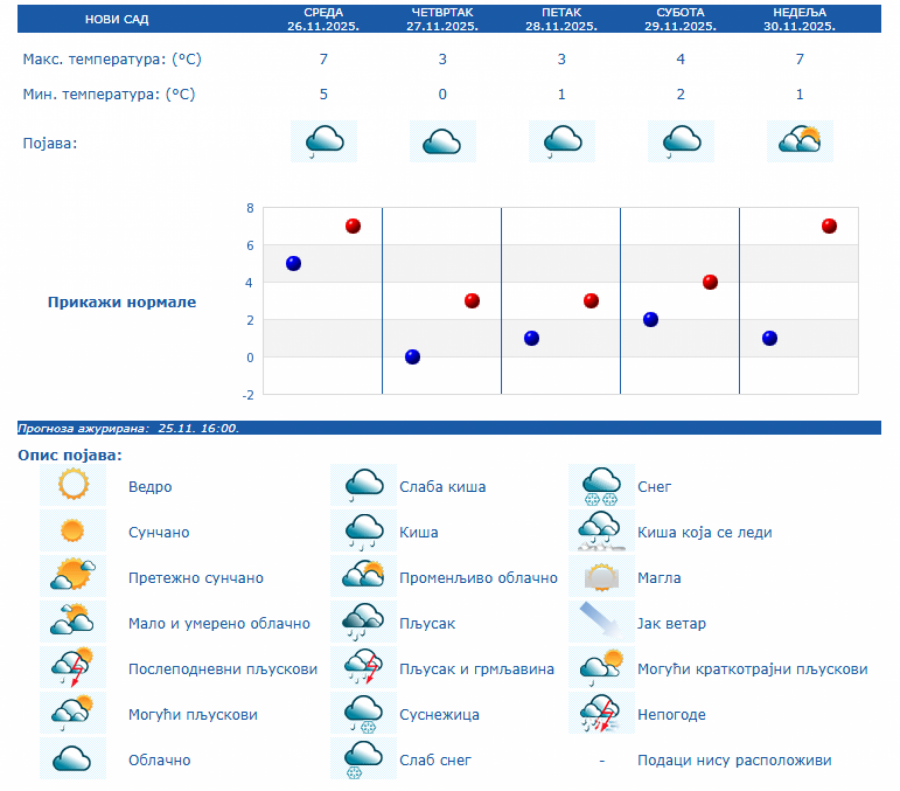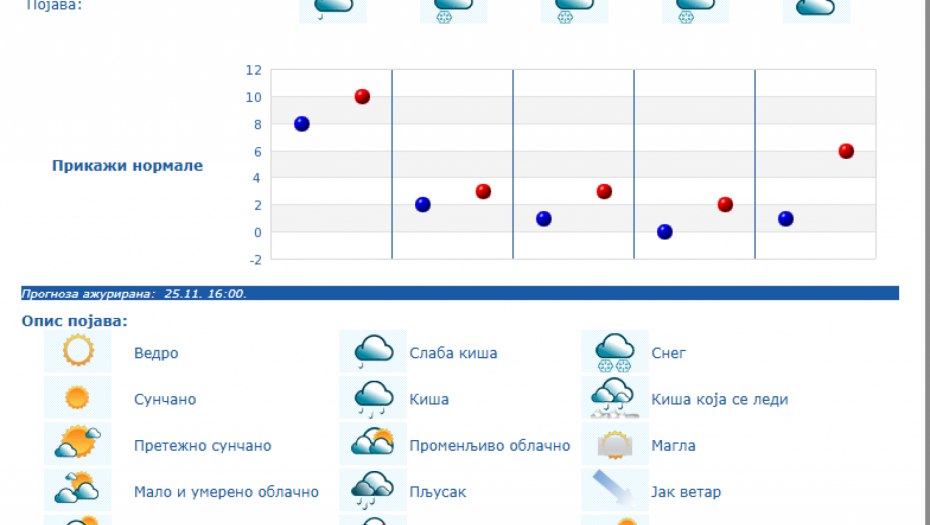 Duvaće umeren zapadni i severozapadni vetar, a na jugu ujutro i pre podne južni i jugozapadni vetar, posle podne u slabljenju. Jutarnja temperatura će biti od 3 do 11 stepeni, najviša dnevna od 7 stepeni na severu do 14 na jugoistoku. U toku noći očekuje se da će temperatura biti u daljem padu, pa se na zapadu i jugozapadu, kao i u planinskim predelima južne Srbije, očekuje sneg.