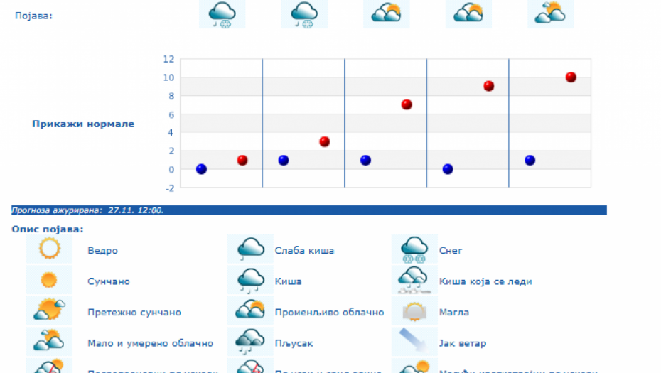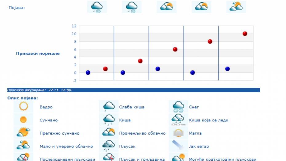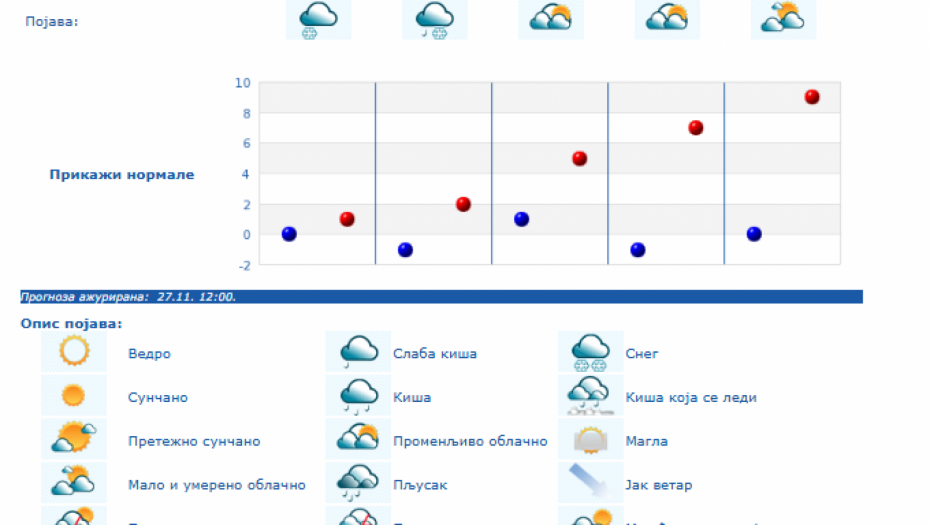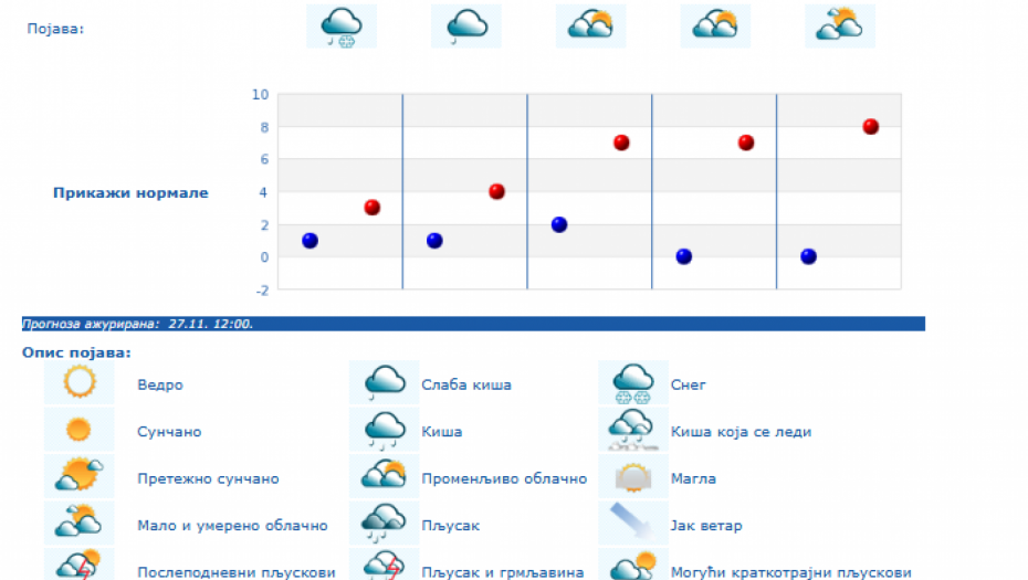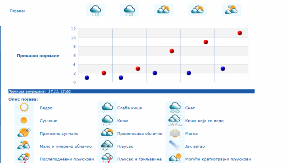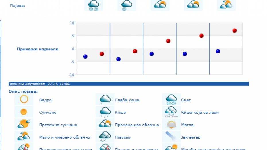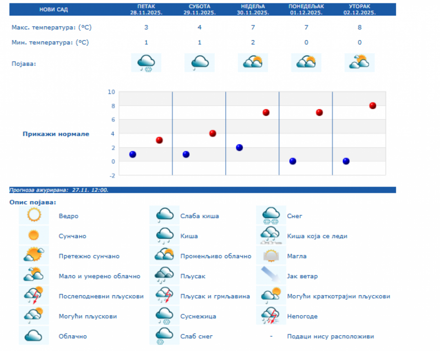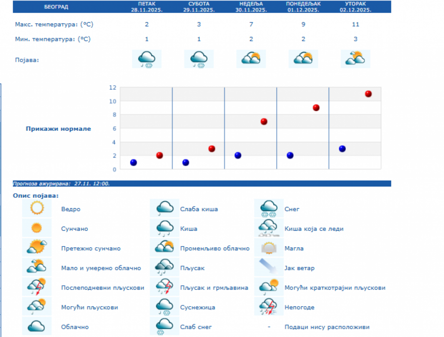 U Beogradu će biti oblačno i hladno, povremeno sa slabim snegom i susnežicom, u nižim delovima grada i kišom. U višim delovima grada očekuje se formiranje manjeg snežnog pokrivača. Duvaće slab do umeren severozapadni vetar. Dnevna temperatura biće bez većeg kolebanja oko 2 stepena.