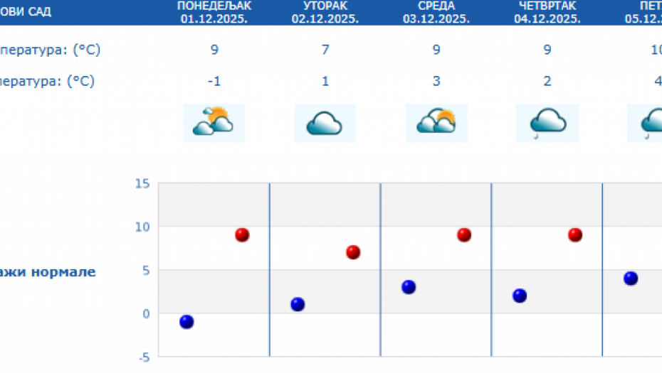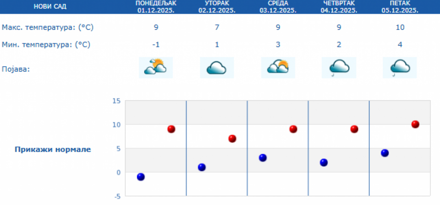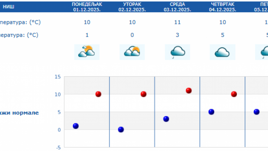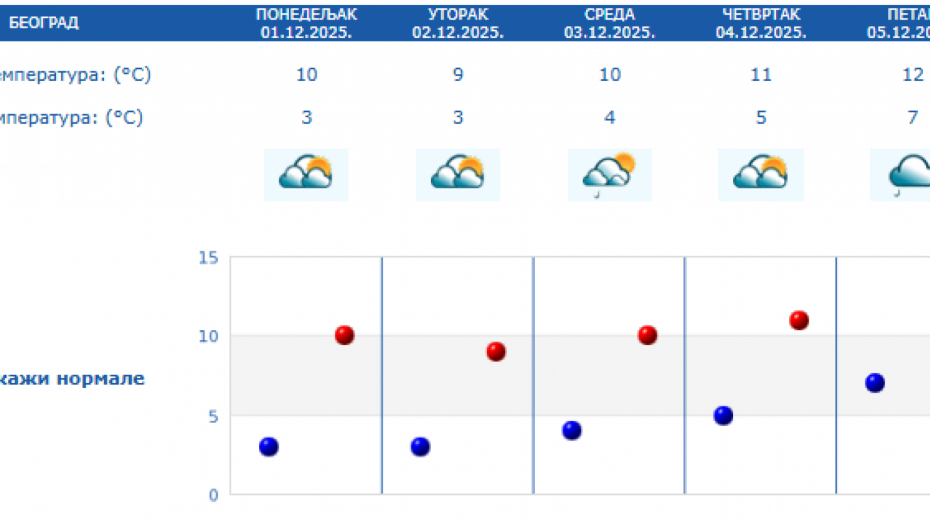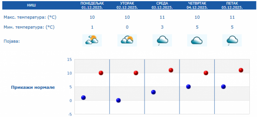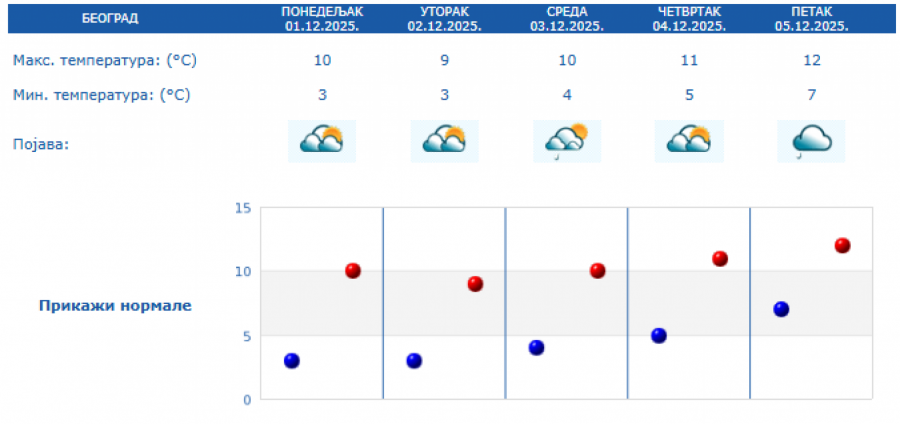 U Srbiji će u utorak, 2. decembra naoblačenje koje će ujutru pre podne zahvatiti severne i zapadne krajeve, posle podne da se proširi i na ostale predele Srbije, a slaba kiša se uveče i tokom noći očekuje mestimično u zapadnim, centralnim i južnim krajevima, saopštio je danas Republički hidrometeorološki zavod