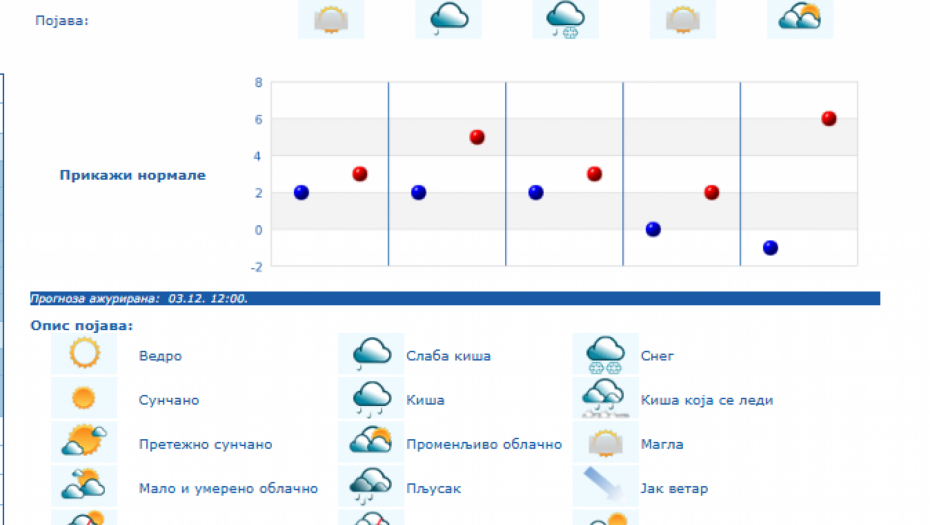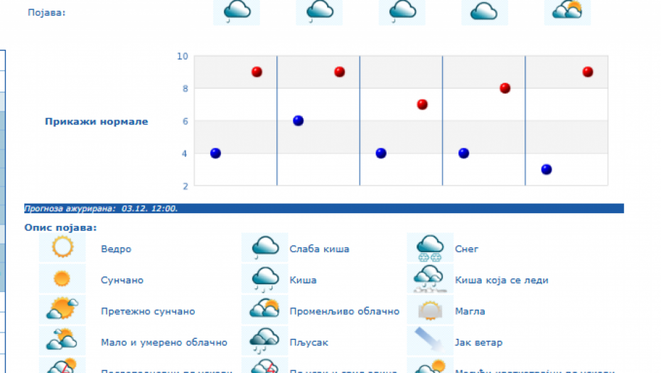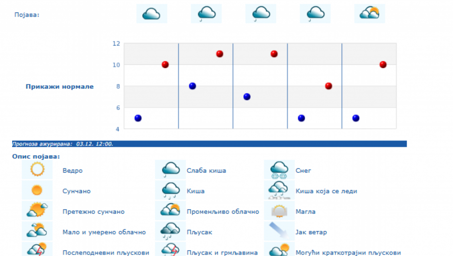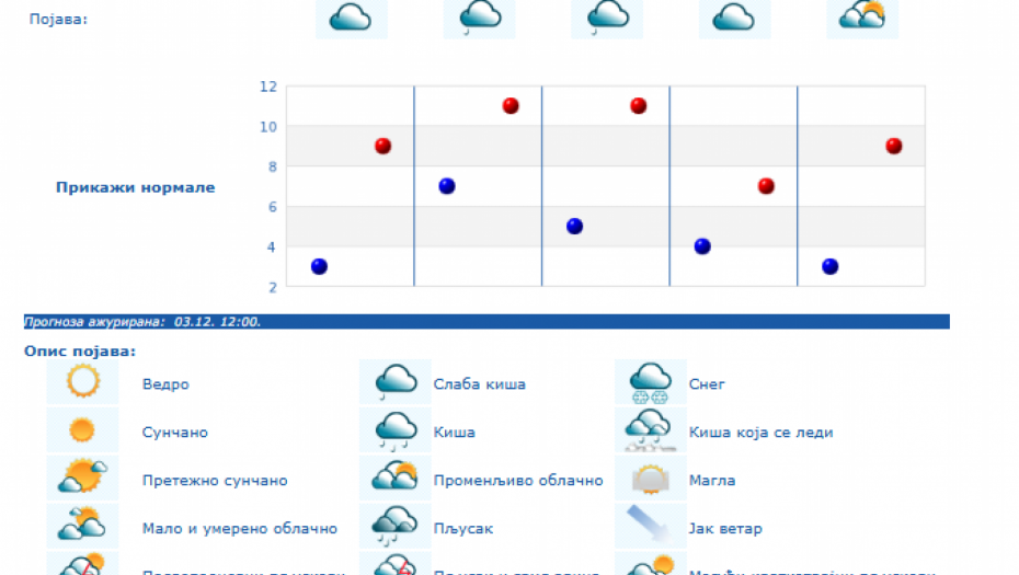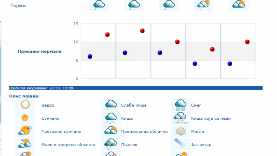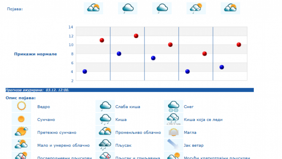 Do nedelje će se zadržati umereno do potpuno oblačno vreme, mestimično sa slabim padavinama, uglavnom u vidu kiše, a slab sneg se očekuje samo na visokim planinama.