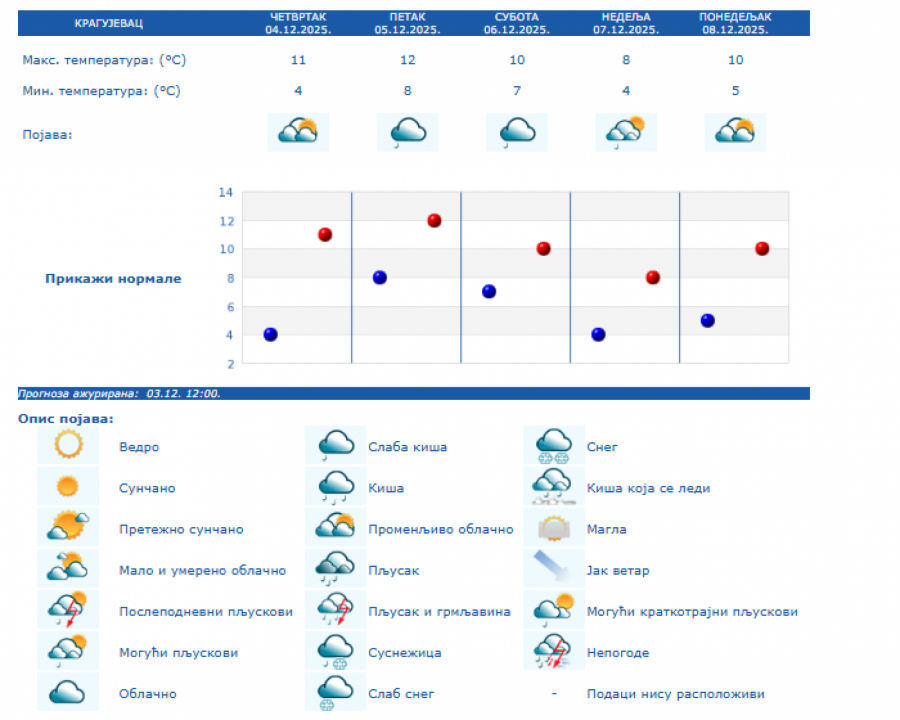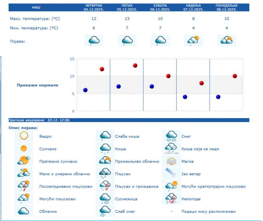 U Srbiji će u četvrtak, 4. decembra tokom dana biti umereno do potpuno oblačno, na severu, zapadu i jugozapadu, a uveče ponegde i u ostalim krajevima sa slabom kišom, saopštio je Republički hidrometeorološki zavod.