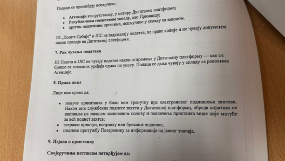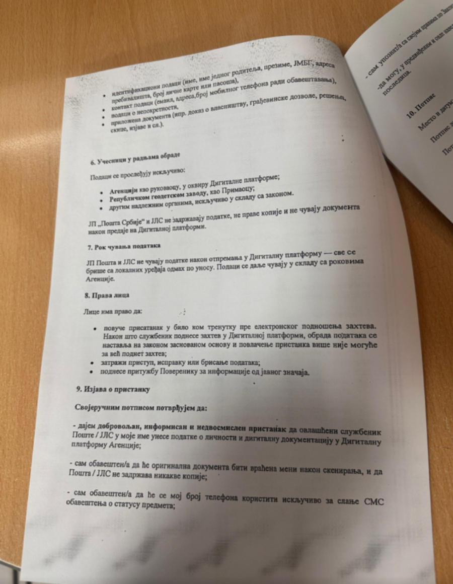 Reč je o obrascu koji služi za davanje pristanka zaposlenom u JP "Pošta Srbije" i JLS da, u ime podnosioca zahteva, unese njegove podatke o ličnosti u Digitalnu platformu za sprovođenje postupka evidentiranja nepokretnosti.
