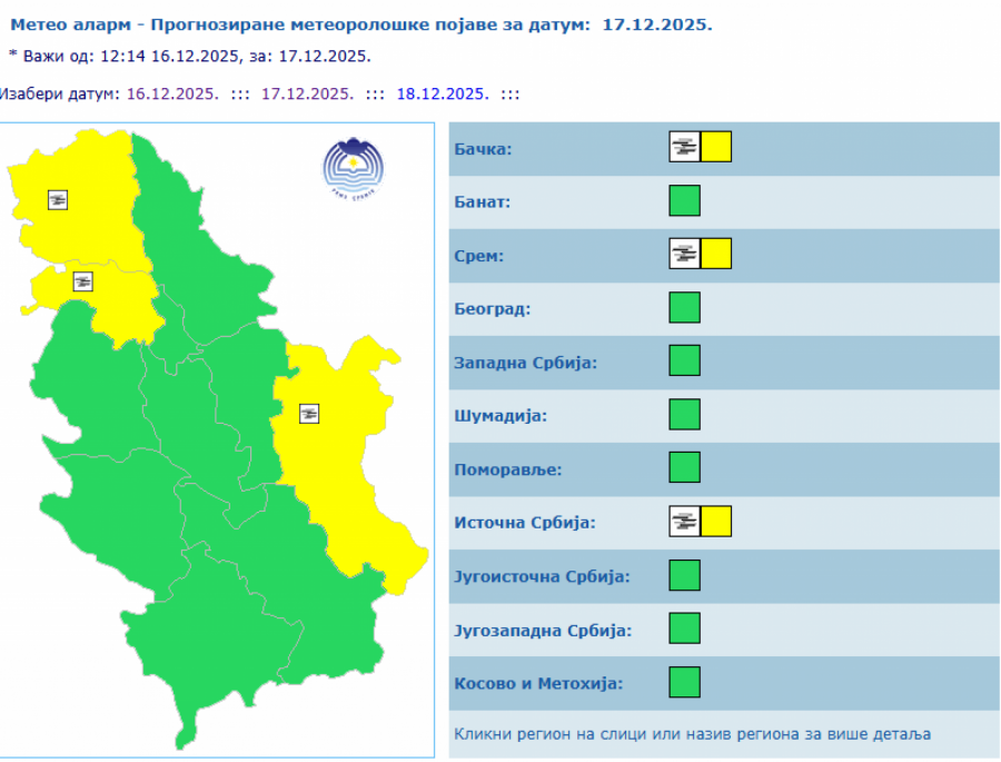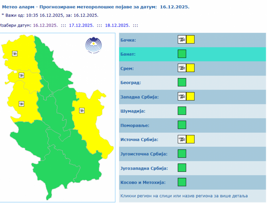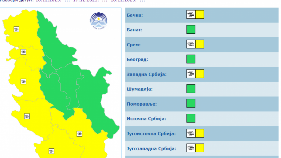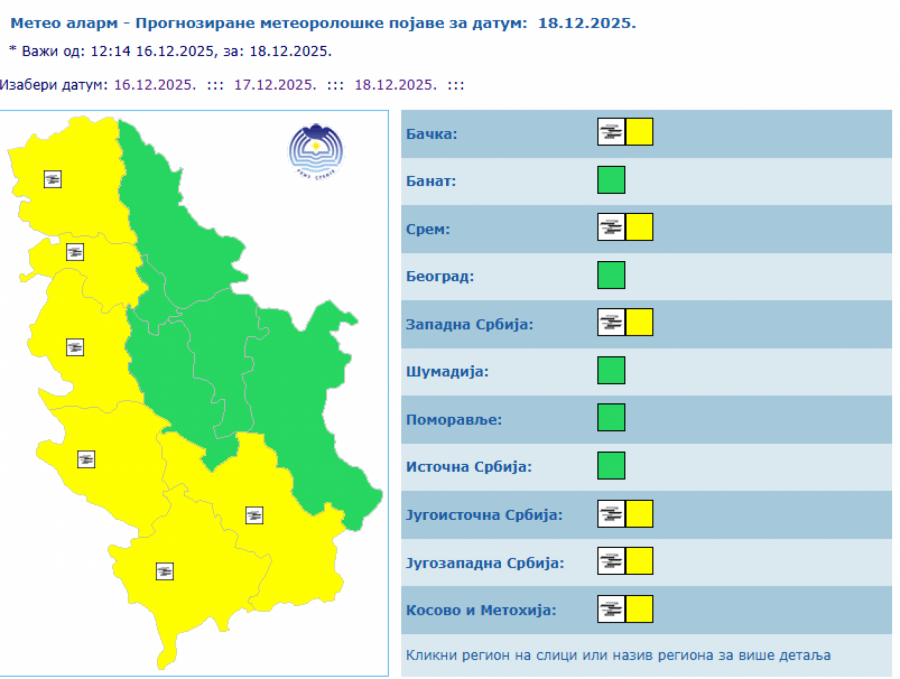 Ponegde se očekuje i kiša, koja se u brdsko-planinskim predelima jugozapadne Srbije u jutarnjim satima lokalno može i da smrzava na tlu.