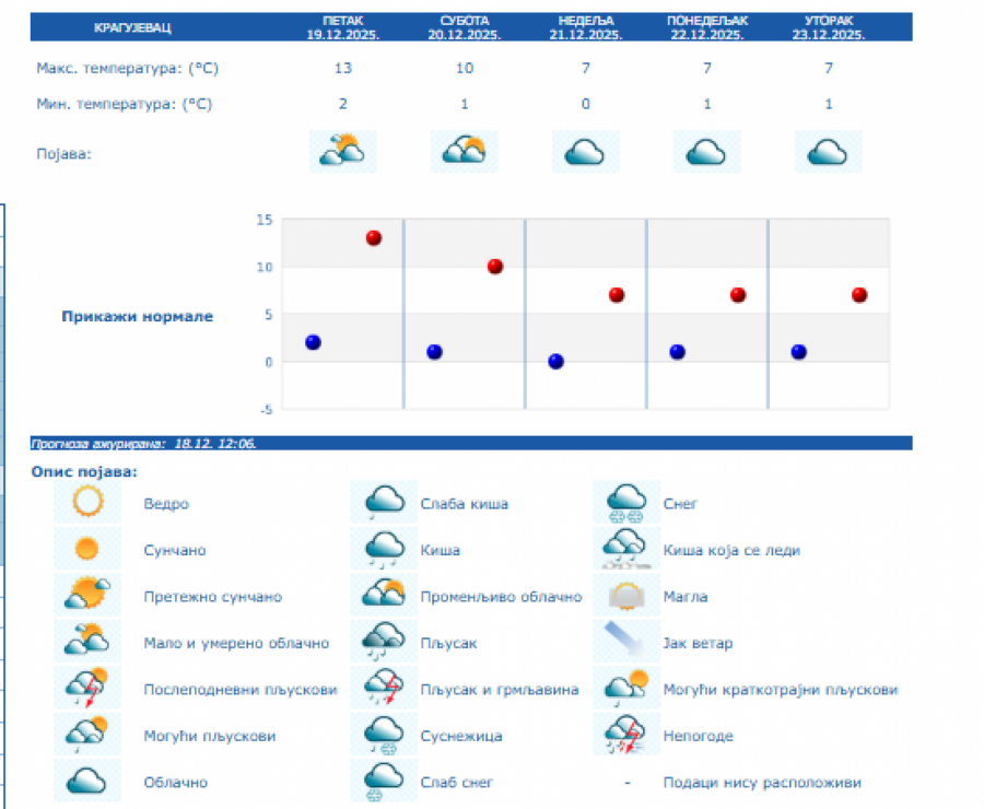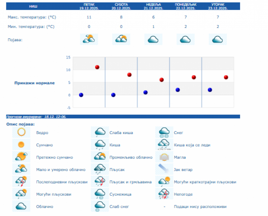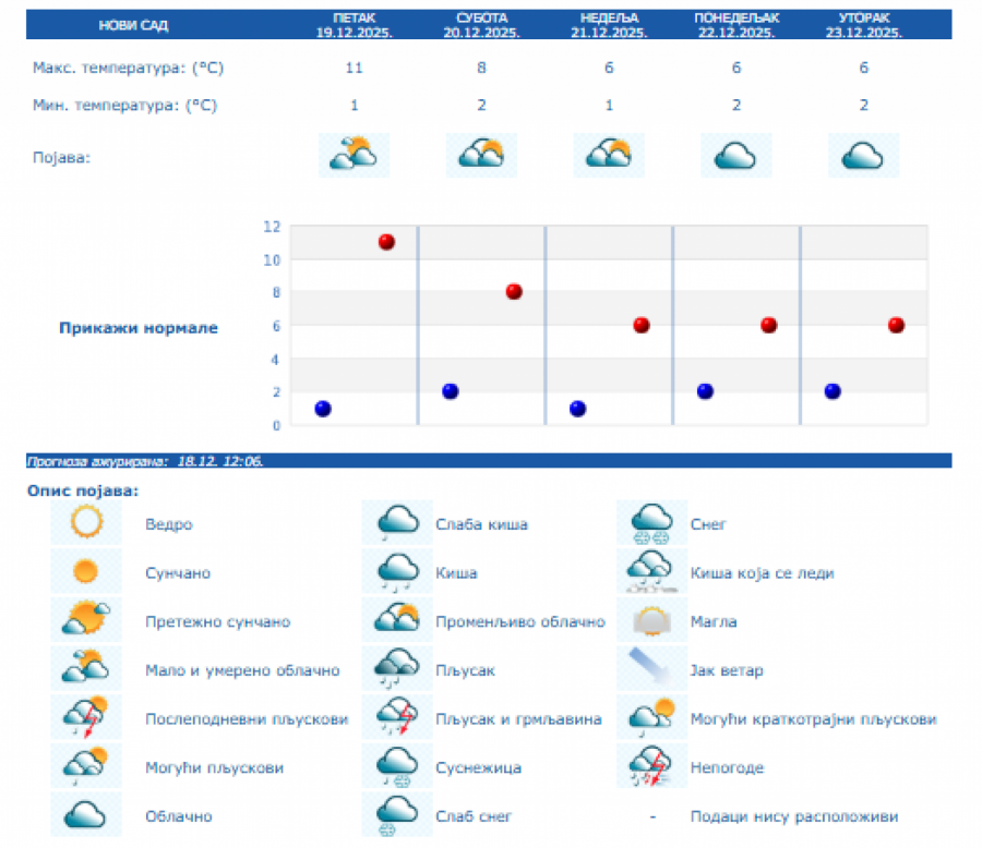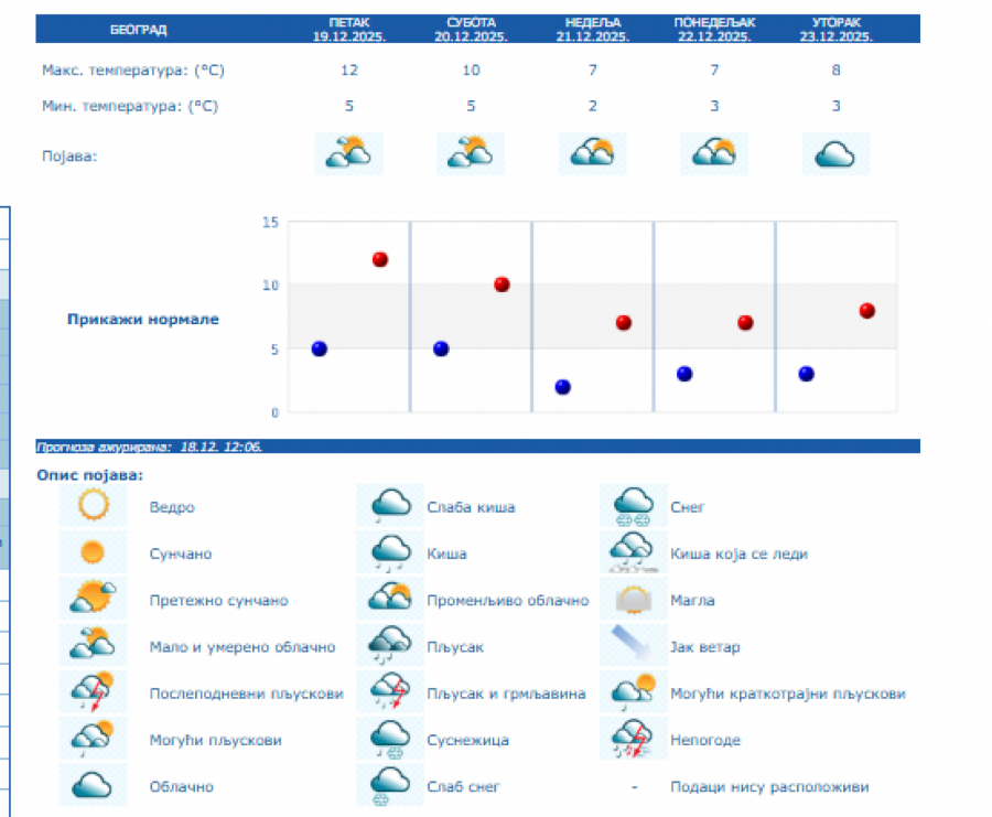 U Srbiji će u petak, 19. decembra tokom dana biti pretežno sunčano vreme uz malu ili umerenu oblačnost i slab južni i jugoistočni vetar, dok se uveče i tokom noći u nižim predelima očekuju niska oblačnost i magla, saopštio je Republički hidrometeorološki zavod.