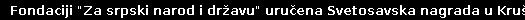 Sinoć je u Kruševačkom pozorištu održana Svetosavska akademija, na kojoj je Fondaciji „Za srpski narod i državu“ svečano uručena Svetosavska nagrada za kontinuiran i višeslojan doprinos očuvanju kulturnog, istorijskog i duhovnog nasleđa srpskog naroda na prostoru Kruševca i Rasinskog okruga.