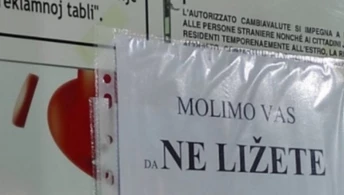 "Molimo vas da NE LIŽETE prste kad brojite pare ili odvajate račune", stoji na poruci zalepljenoj iznad šaltera.