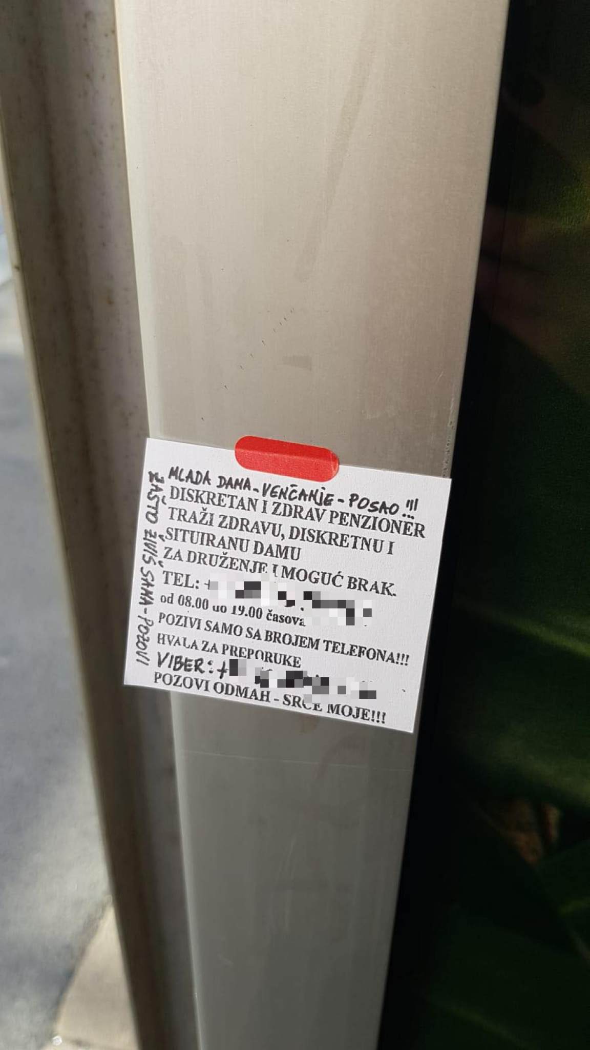 - Diskretan i zdrav penzioner traži zdravu, diskretnu i situiranu damu za druženje i moguć brak. Pozovi samo sa brojem telefona od 8 do 19 časova. Hvala za preporuke. Pozovi odmah - srce moje - glasi oglas, na kom su ostavljeni i brojevi telefona, kako za zvanje, tako i jedan i za Viber.