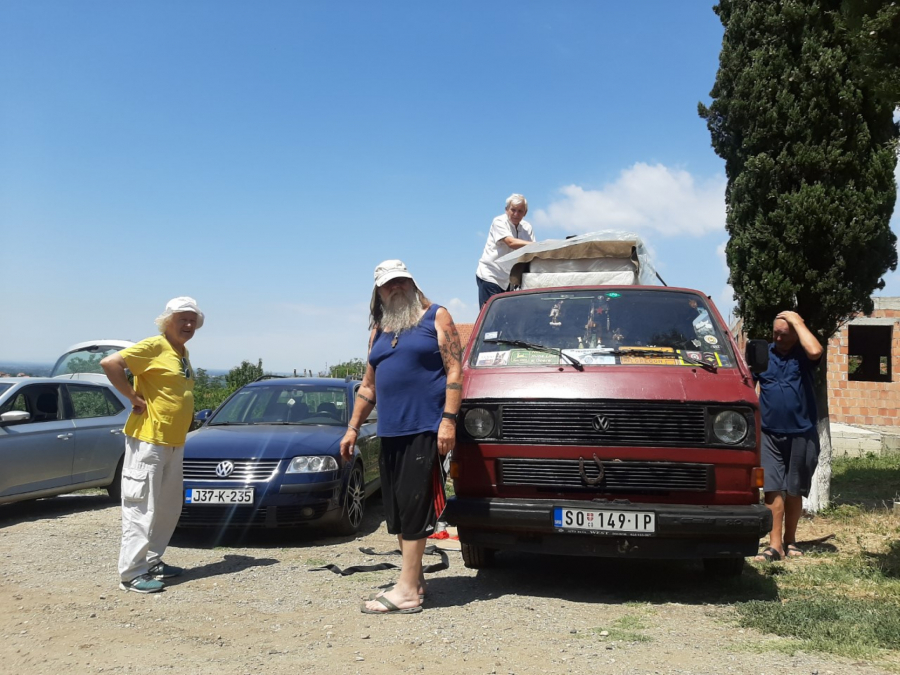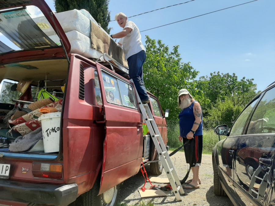 - Milorad Đene Rađenović će ti reći gde smo sve bili, kad spakuje dušeke na kombi i siđe niz lotre... On je naš major bezbednosti i strašno pamti! Bilo je puno kolonija širom sveta... Pre ove smo obišli i naslikali 12 manastira Fruške Gore, ali je došla korona, pa smo prekinuli - kaže Brkanović, dok Rađenoviću uz pomoć štafelaja dotura pojas da veže dušeke za prtljažnik na krovu kombija i poručuje da njihova bratija posle Bariča ide u Banjaluku i Grocku.