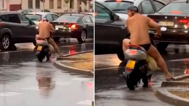 Kiša koja je padala juče probudila je, izgleda, u ovom vozaču avanturistički duh, pa je rešio da se gradom provoza na skuteru noseći kupaće gaće.