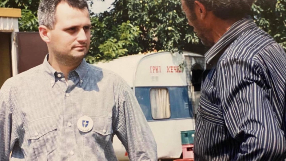 Proveo sam na putu sedam dana. Ni sam ne znam koliko su tona hrane beogradski ugostitelji, dobri ljudi, pripremili i koliko smo ljudi nahranili, jer mnogima je to bio prvi topli obrok još od Krajine. Ova slika je nastala u trenutku kada sam čekao da dođe naredni kombi sa hranom i dok razgovaram sa čovekom iz kolone. Bedž koji imam na košulji pripada gradskoj opštini Vračar jedinoj beogradskoj opštini koja je te 1995. godine organizovala pomoć za prognane.