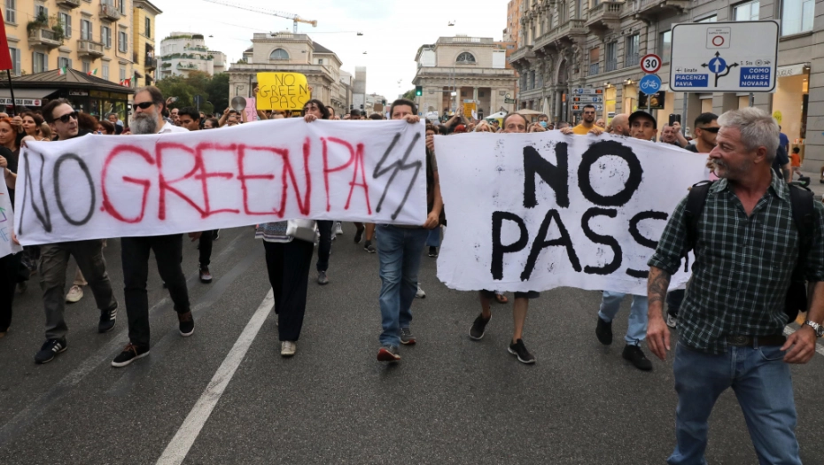 Hiljade su demonstrirale i u Milanu, a neki su nosili značke sa Davidovom zvezdom poput onih koje su nosili Jevreji u Nemačkoj u doba nacista, sa rečima „nije vakcinisan“, prenela je novinska agencija ANSA.