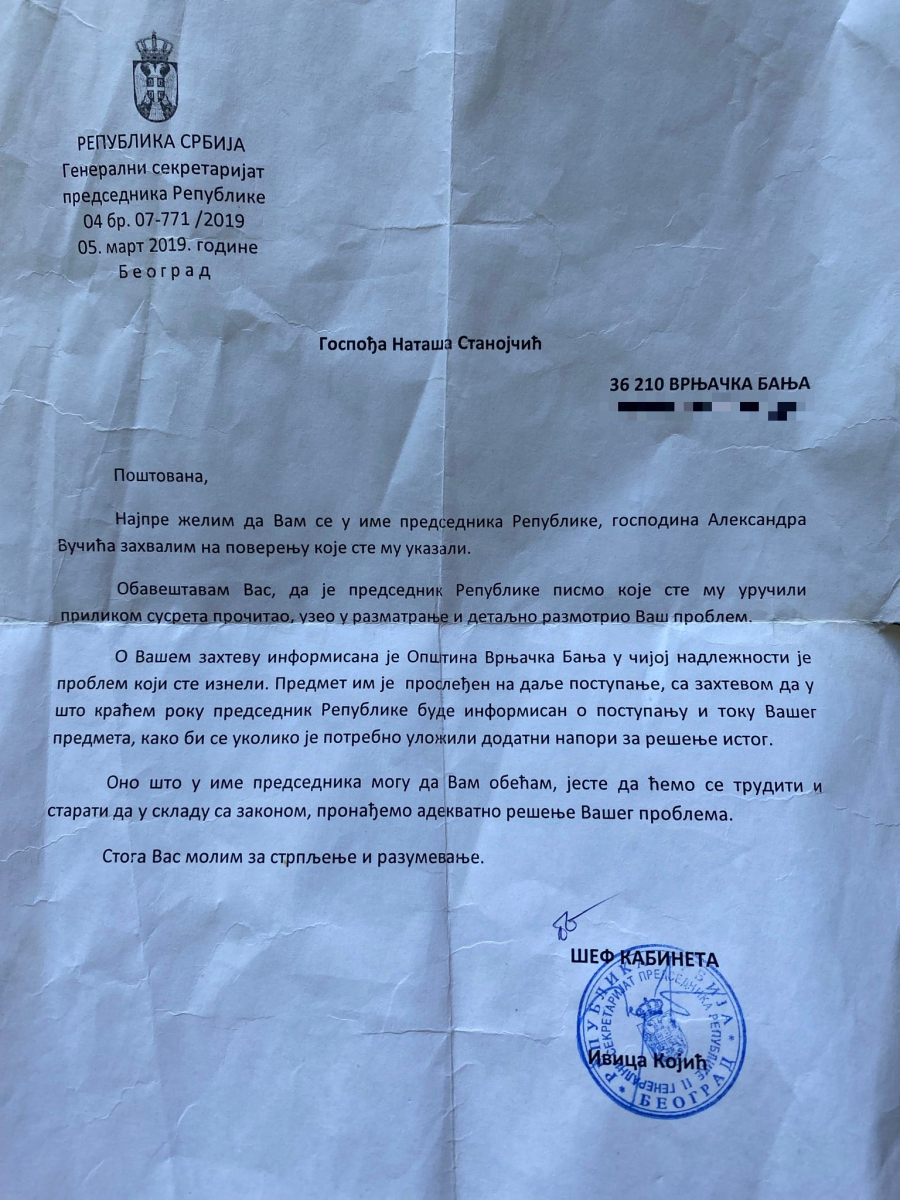 - I dan danas mi je lepo kada pričam o tome. Javila mi se žena, sa veoma prijatnim glasom, a od silnog uzbuđenja, pomislila sam da je to neko ko me poznaje, a ja ne znam ko je osoba i još mi se obraća sa "Vi". Rekla mi je: "Mi smo Vas zvali. Predsednik Vučić je želeo da razgovara sa Vama. Vi se niste javili tada, a on je trenutno na putu. Da li imate neku poruku za njega i da li želite da se čujete sa njima kada se vrati u Srbiju?". Ne znam šta je u tom trenutku preovladalo u meni, da li je zamisao koja je bila u mojoj glavi bila ispunjena, želja ostvarena. Kada sam je upitala o čemu se radi, samo je kratko odgovorila: "O pismu koje ste dali predsedniku. Odgovor će Vam stići najkasnije do petka." Tako je i bilo, poštar je doneo pismo u petak. Otvorila sam ga – priča Nataša kroz suze – i videla obećanje koje je, imam utisak, meni promenilo život. Donekle i jeste tako bilo. Presrećna sam bila i nisam verovala da se to meni desilo. Istog trenutka sam pozvala predsednika Vrnjačke Banje Bobana Đurovića koji mi je rekao da čim budu dobili zvanično saopštenje da ću biti obaveštena.