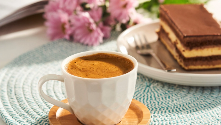 Ajde ne pricajte svasta.Pravi ljubitelj kafe pije jaku,crnu,bez secera i uz dim dobre cigarete uziva u mirisu i ukusu kafe. A slatkisi moze, al posle kafe, nikako uz kafu.