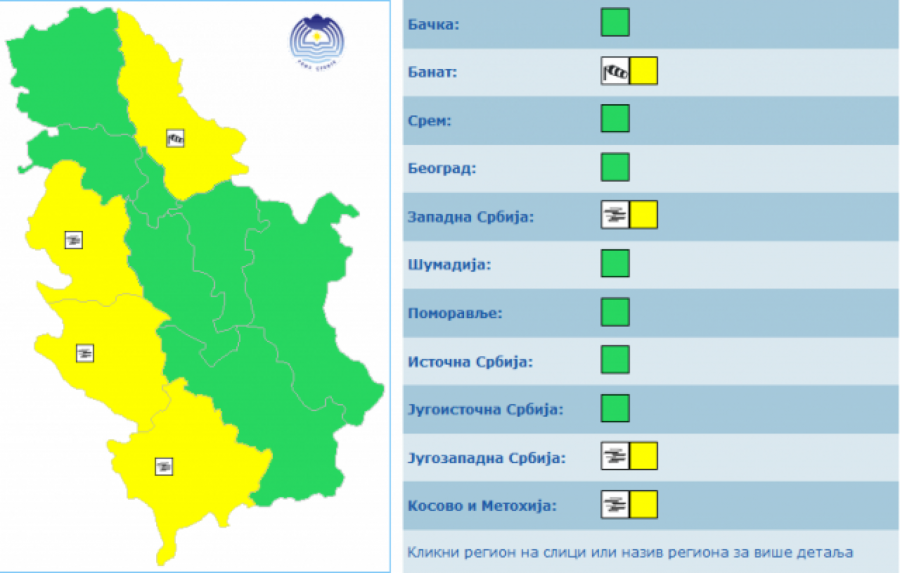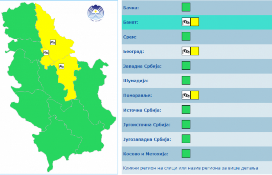 Za sutra se potencionalno opasno vreme može očekivati i dalje u Banatu kao i u Zapadnoj Srbiji kao i na područiju KIM, gde će i dalje biti upaljen žuti meteo alarm.