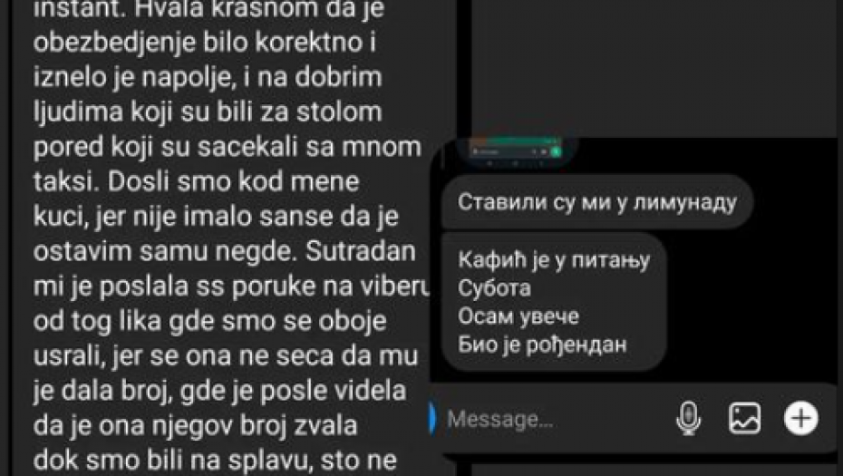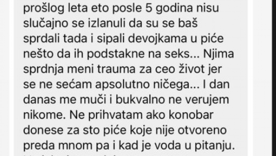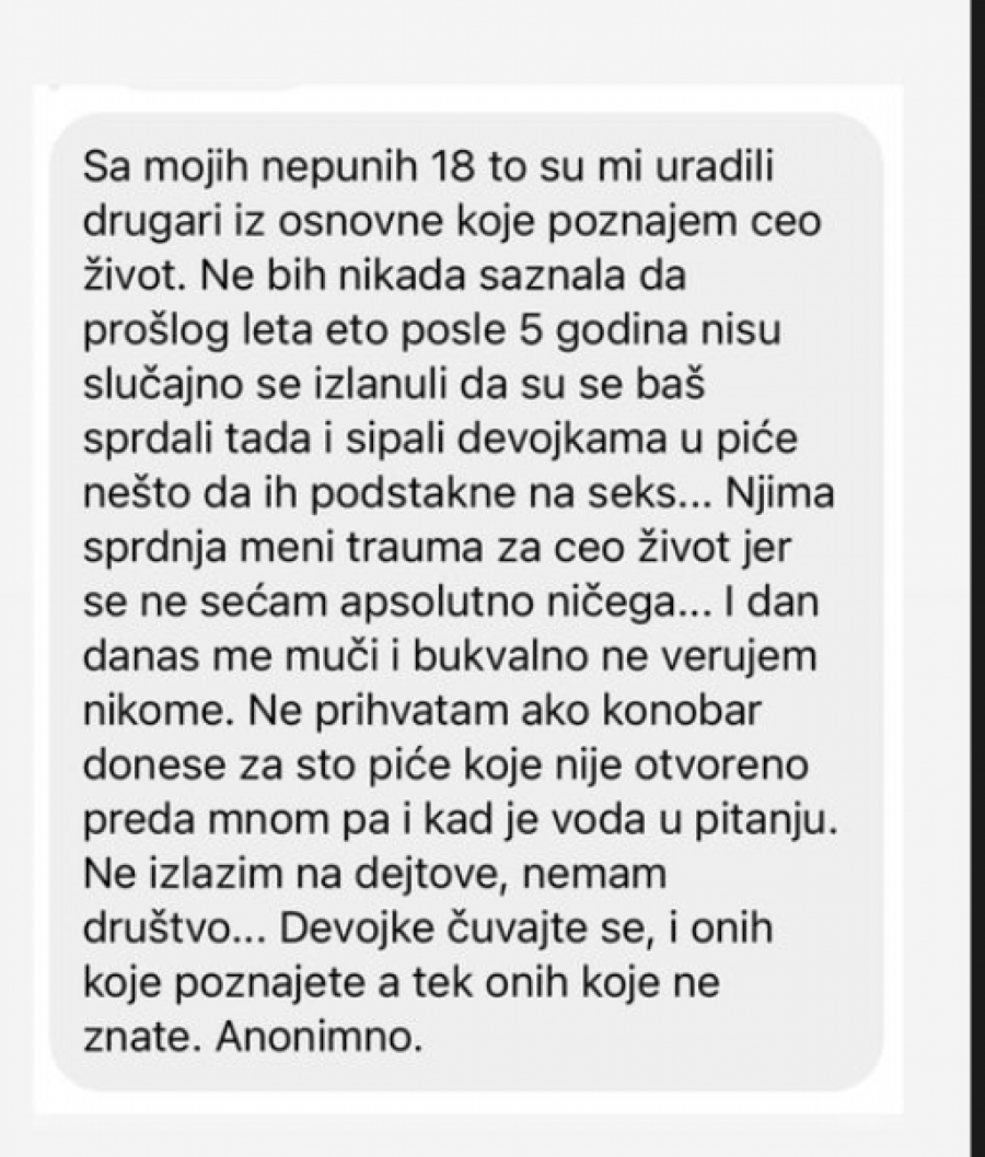 - U jednom momentu gubim pamćenje, i budim se ujutro, totalno dezorijentisana, ne znajući šta se prethodno veče izdešavalo. Ulazim na Instagram, kad ono šok! Nalazim se u grupnom dopisivanju i osobe od prethodne večeri postavljaju moj snimak gde se iživljavaju nada mnom! Snimak nikada nisam imala snage da pogledam, ali sam shvatila iz njihovih komentara o čemu je reč. Narednih dana počinju da mi se javljaju ljudi iz raznih delova Srbije i nude mi nepristojne ponude zbog snimka – priseća se ona nemilog događaja.