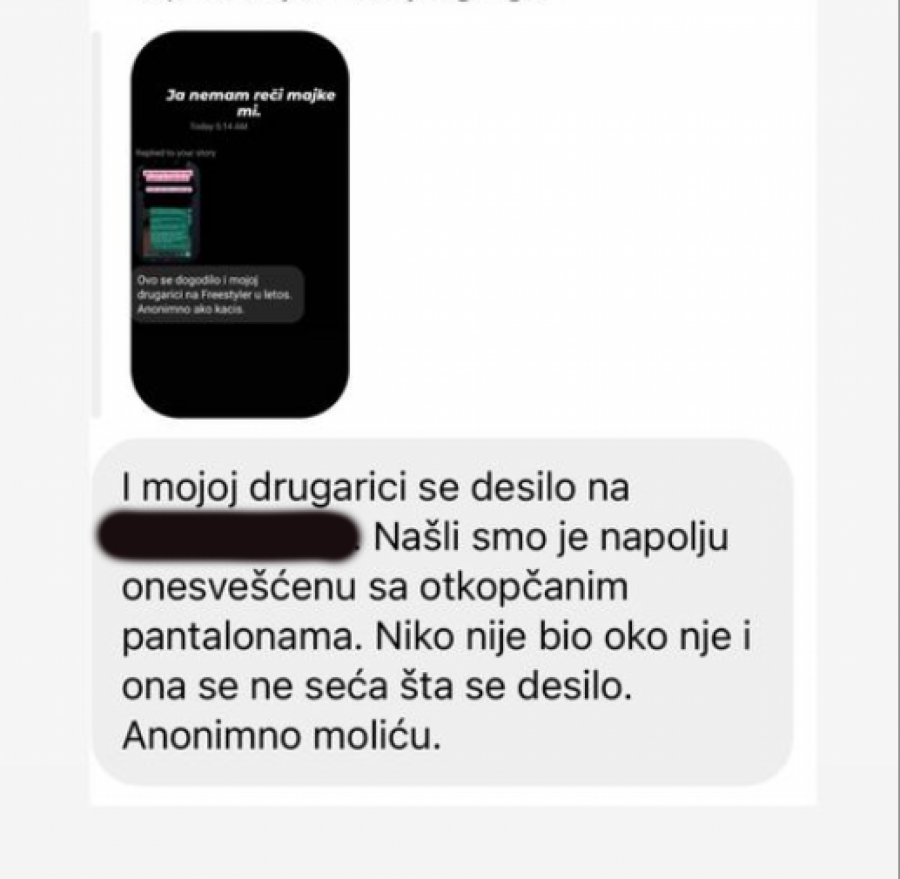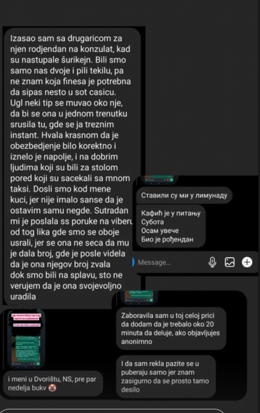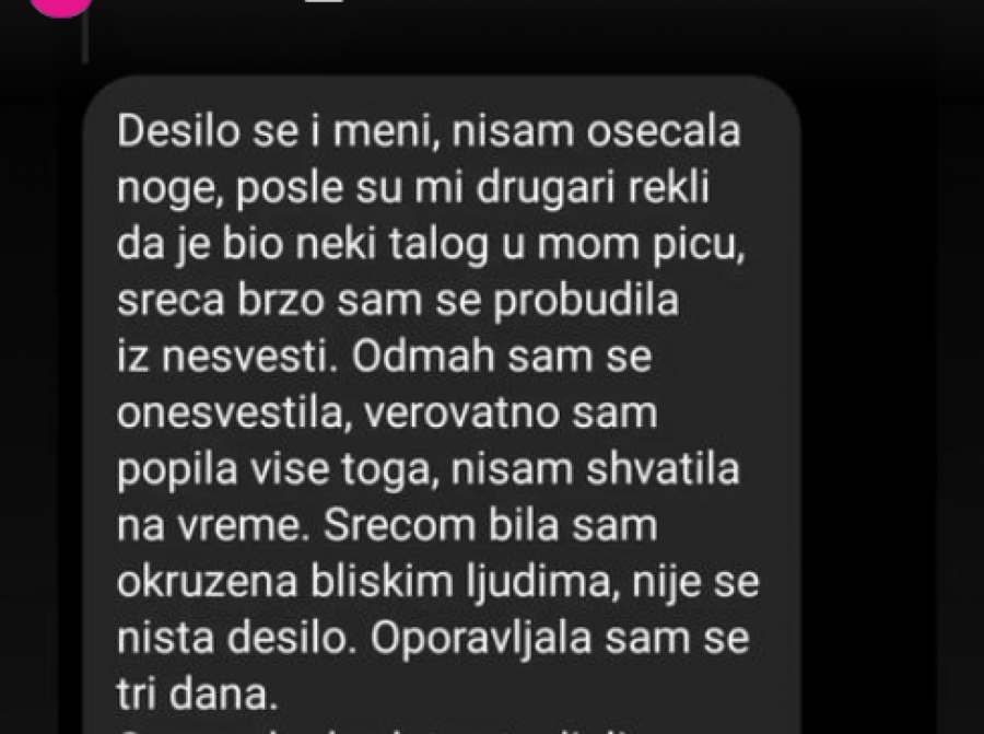 Nakon što je na društvenim mrežama čula da nije jedina žrtva ovakvog zlostavljanja, jedna Novosađanka je rešila da o svom lošem iskustvu progovori glasno i jasno. Napravila je profil na Tviteru na kom je objasnila tako da svima bude jasno šta se dešava u ozloglašenim noćnim klubovima, ali i u sred bela dana, u restoranima, kafeima, pa i na kućnim žurkama.