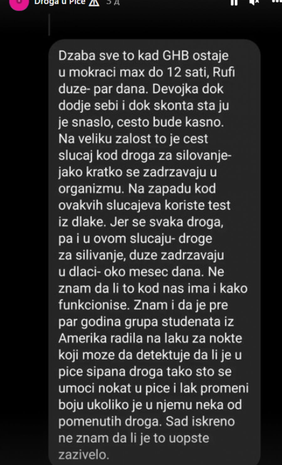 Kako sama kaže, njen razlog da podeli ovu priču je da podstakne sve koji dođu u sličnu situaciju da se ne plaše, već da odmah slučaj prijave i da instistiraju na testovima da bi kasnije mogle da dokažu šta se desilo.