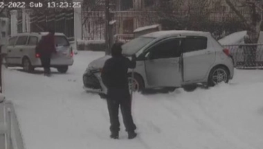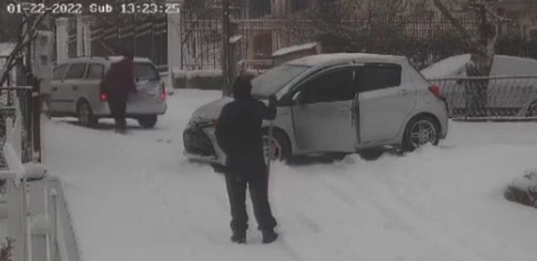 Na snimku se vidi kako jedan automobil prolazi pored drugog koji je proklizao na ledu, a nedugo zatim i on proklizava i udara vozilo koje je već zaglavljeno.
