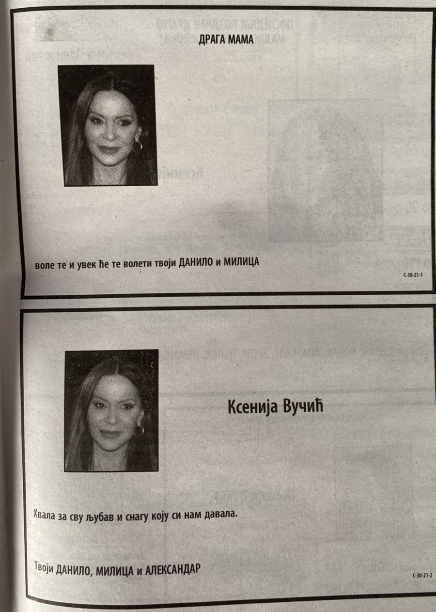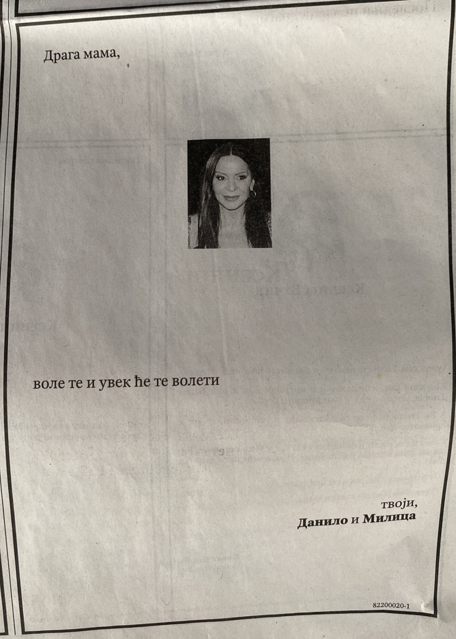 - Draga mama, vole te i uvek će te voleti tvoji Danilo i Milica - objavljeno je u drugoj čitulji koju su sin i ćerka dali.