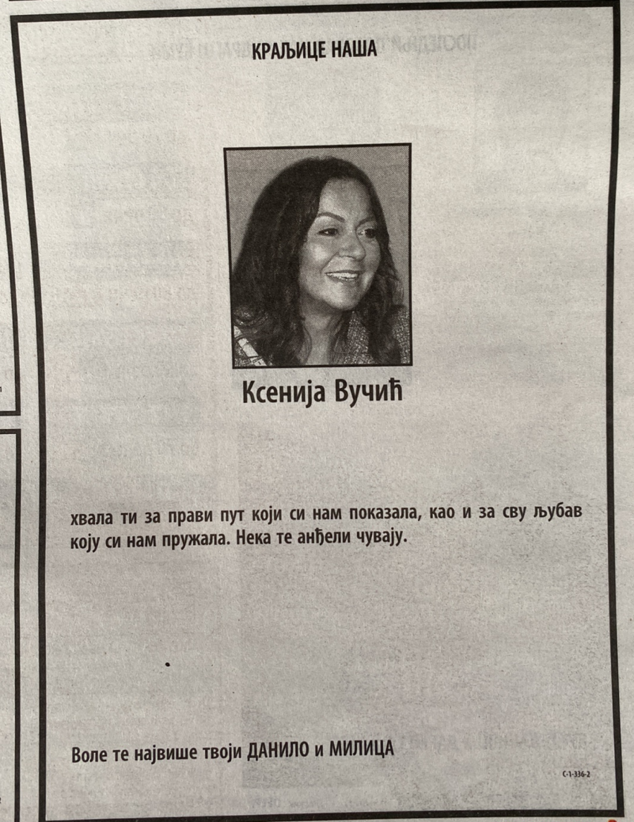 - Kraljice naša, hvala ti za pravi put koji si nam pokazala, kao i za svu ljubav koju si nam pružala. Neka te anđeli čuvaju. Vole te najviše tvoji Danilo i Milica - stoji u čitulji.