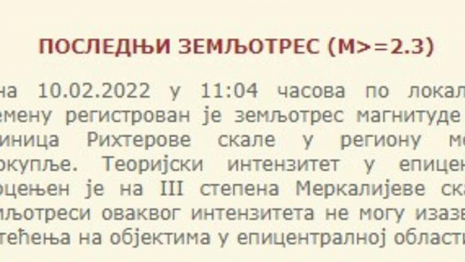 To se desilo u 11.04 časova po lokalnom vremenu. Teorijski intenzitet u epicentru procenjen je na III stepena Merkalijeve skale, može se pročitati na sajtu Seizmološkog zavoda Srbije.