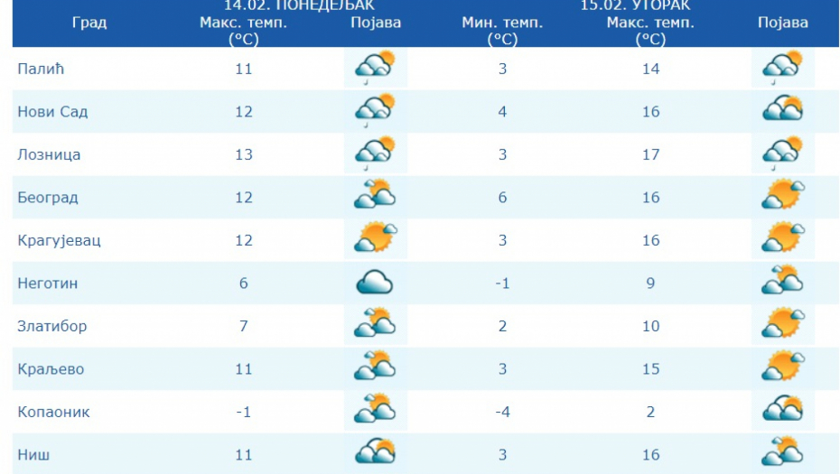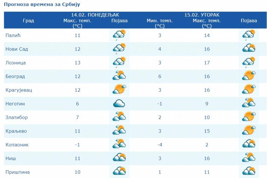 U utorak u većem delu pretežno sunčano. Na jugu Srbije promenljivo oblačno. Vetar slab i umeren, južni i jugoistočni. Najniža temperatura od -2 do 6 stepeni, najviša dnevna od 9 do 18 stepeni. Uveče i u toku noći sa severa i zapada naoblačenje s kišom, na visokim planinama i sa snegom.
