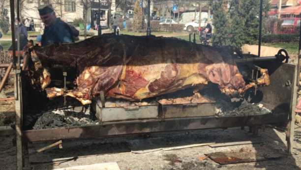 Na platou ispred zgrade opštine Mladenovac građani mogu da se posluže kuvanim vinom, rakijom, čajem a ono što svakako privlači pažnju jeste vo na ražnju.