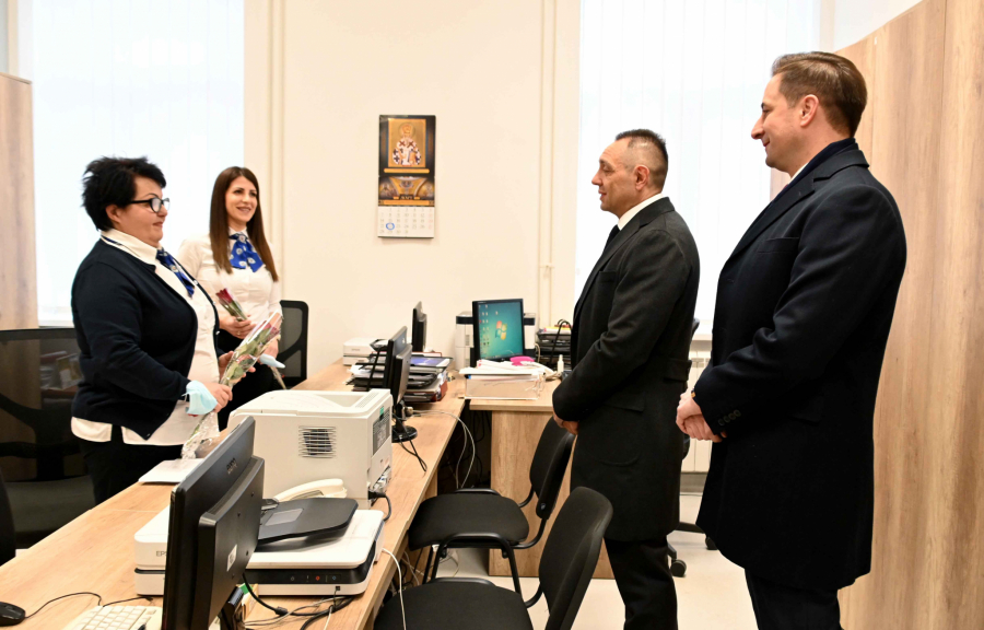 Ministar Aleksandar Vulin je pripadnicama policije koje rade na upravnim poslovima simboličnim poklonom česitao Dan žena i zahvalio im se za sve što čine da Ministarstvo unutrašnjih poslova bude tako uspešno.