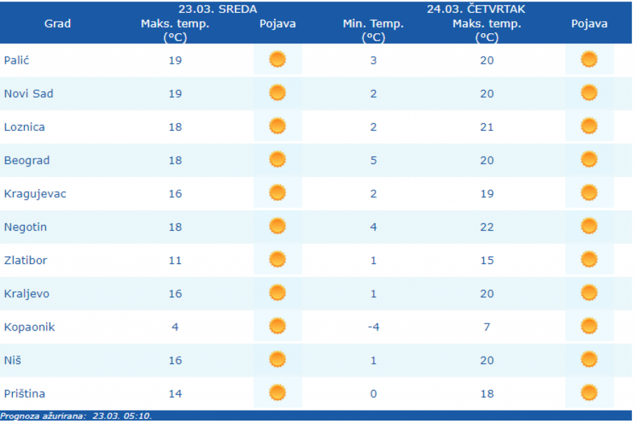 Prema prognozi Republičkog hidrometeorološkog zavoda, ujutro slab i umeren prizemni mraz, a na istoku i jugu ponegde se očekuje i slab mraz na dva metra visine. Tokom dana sunčano i toplo.