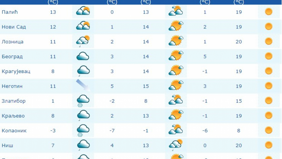 Vetar slab i umeren, severozapadni i zapadni. Jutranja temperatura od -1 do 5, a najviša dnevna od 12 do 15 stepeni, saopštio je Republički hidrometerološki zavod.