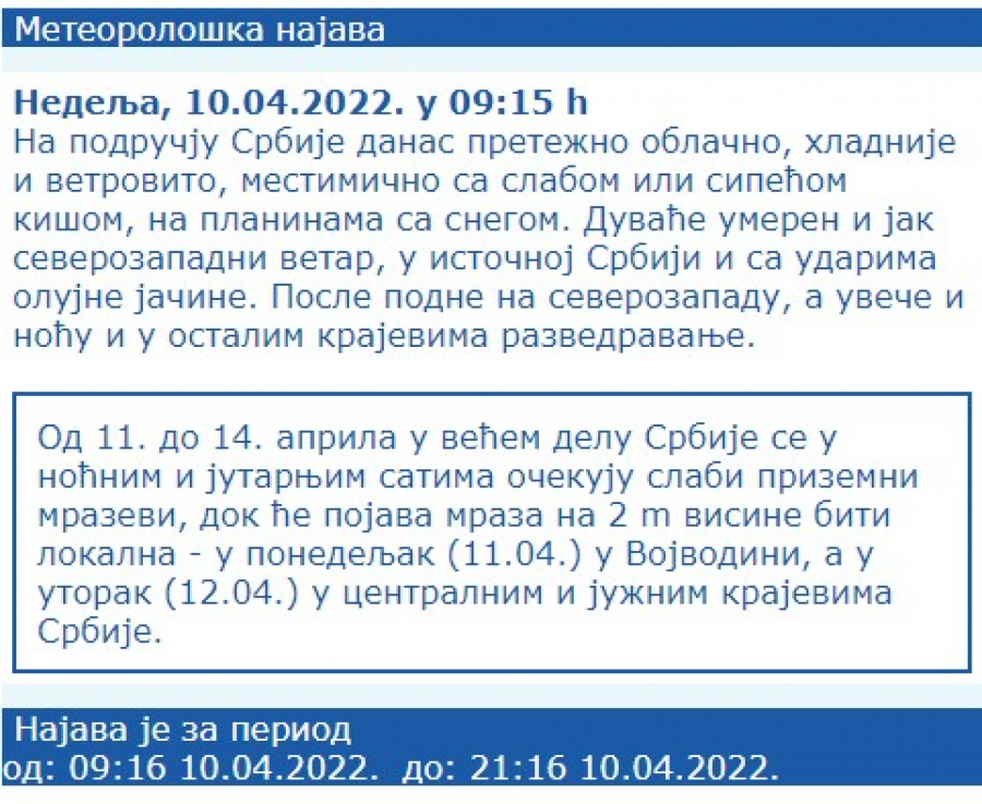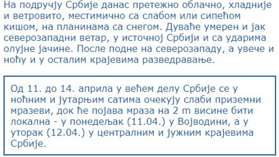 U Srbiji se do četvrtka, 14. aprila, u noćnim i jutarnjim satima očekuje slab prizemni mraz, dok će mraz na dva metra visine biti samo lokalna pojava u utorak u centralnim i južnim krajevima.