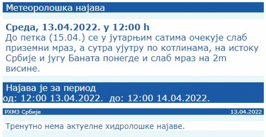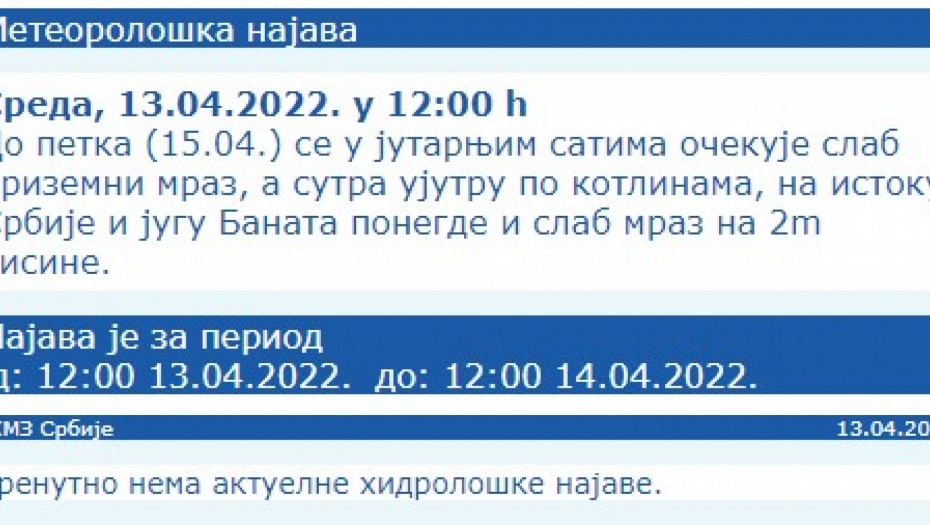 Temperatura će biti oko dva stepena na minimumu, do nula stepeni na jugu Srbije, bez mraza.