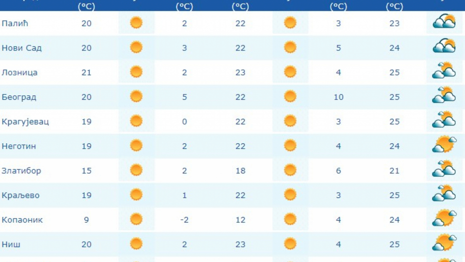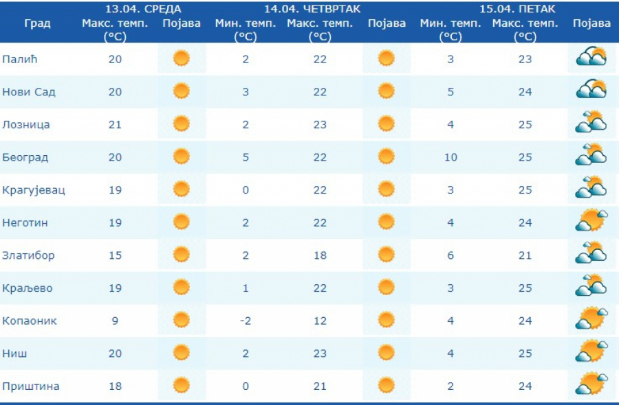 U petak petežno sunčano i toplo, uveče naoblačenje na severu, tokom noći je ponegde moguća kiša. Vetar slab i umeren, severni i severozapadni. Najniža temperatura od 2 do 10, a najviša od 22 do 26 stepeni.