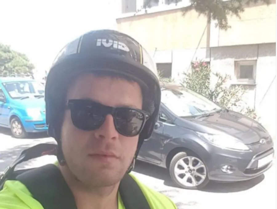Na njoj on nosi kacigu i verovatno vozi skuter ili motor.
