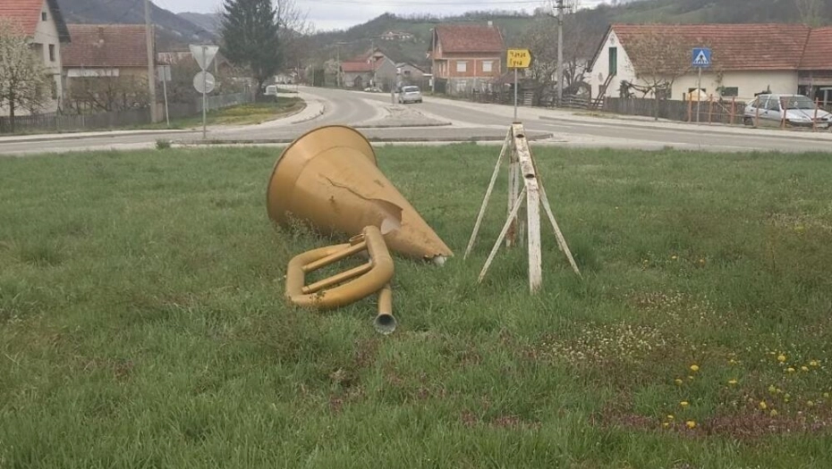VANDALI UNIŠTILI SIMBOL GUČE Slomljena velika truba postavljena na kružnom toku!