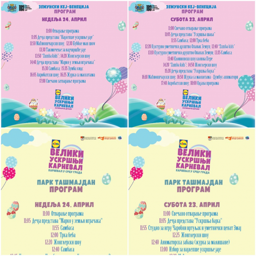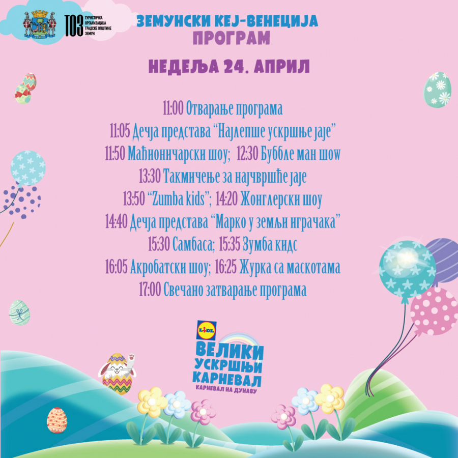 Veliki uskršnji karneval obeležiće mnogobrojni zabavni programi koji će se odvijati na centralnoj festivalskoj bini gde će se smenjivati muzički i plesni nastupi, dečje predstave i razni performansi, ali i na celom festivalskom prostoru na kojem će karnevalsku atmosferu dočarati perkusionisti, mažoretkinje, ulični zabavljači, kao i maskote omiljenih dečjih junaka.