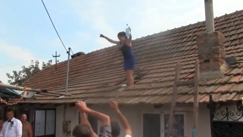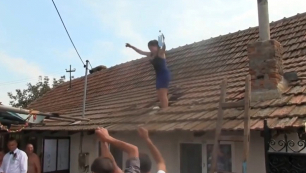 Slavlje u dvorištu kulminiralo je kada se uz zvuke trube kuma popela na krov, a onda počela da lomi crepove.