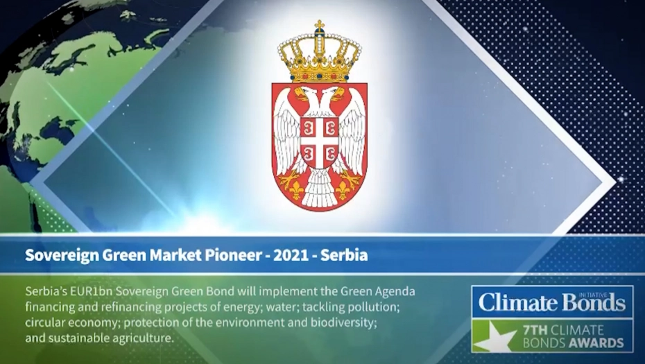 Republika Srbije dobitnik je nagrade „Pionir u oblasti zelenog finansiranja u kategoriji država za 2021. godinu“ (Sovereign Green Market Pioneer in 2021), koju dodeljuje oganizacija Climate Bond Iniative, a ta nagrada je veoma značajna za nas jer nas svrstava u ekološki odgovorne države sveta, objavio je danas ministar finansija u Vladi Srbije Siniša Mali.