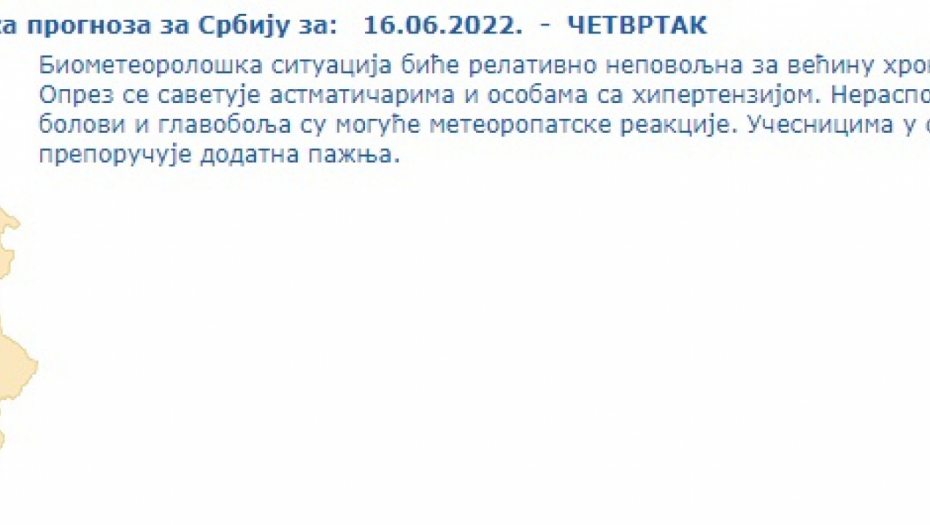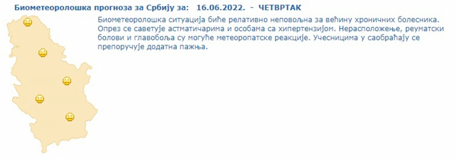 Pretežno sunčano i malo svežije, u brdsko-planinskim predelima uz promenljivu oblačnost mestimično sa kišom ili pljuskovima sa grmljavinom. Vetar slab i umeren severni i severozapadni. Najniža temperatura od 12 do 15, najviša od 23 do 27 stepeni. Upozorenje: Lokalna pojava grmljavina, verovatnoća 70%.