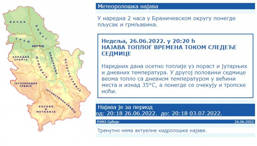 Ponegde se očekuju i tropske noći, najavljeno je iz RHMZ. U većem delu zemlje na snazi će biti žuti meteoalarm koji označava potencijalno opasno vreme.