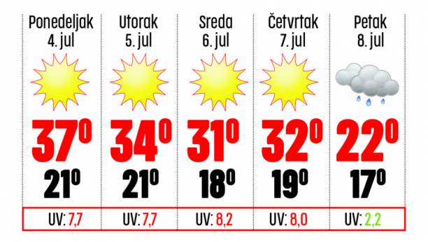 Danas i u prvoj polovini naredne sedmice očekuje nas temperatura od 33 do 36 stepeni. U drugoj polovini sledeće sedmice očekuju se česti kratkotrajni pljuskov sa grmljavinom, a temperatura će biti u padu, posebno od petka.